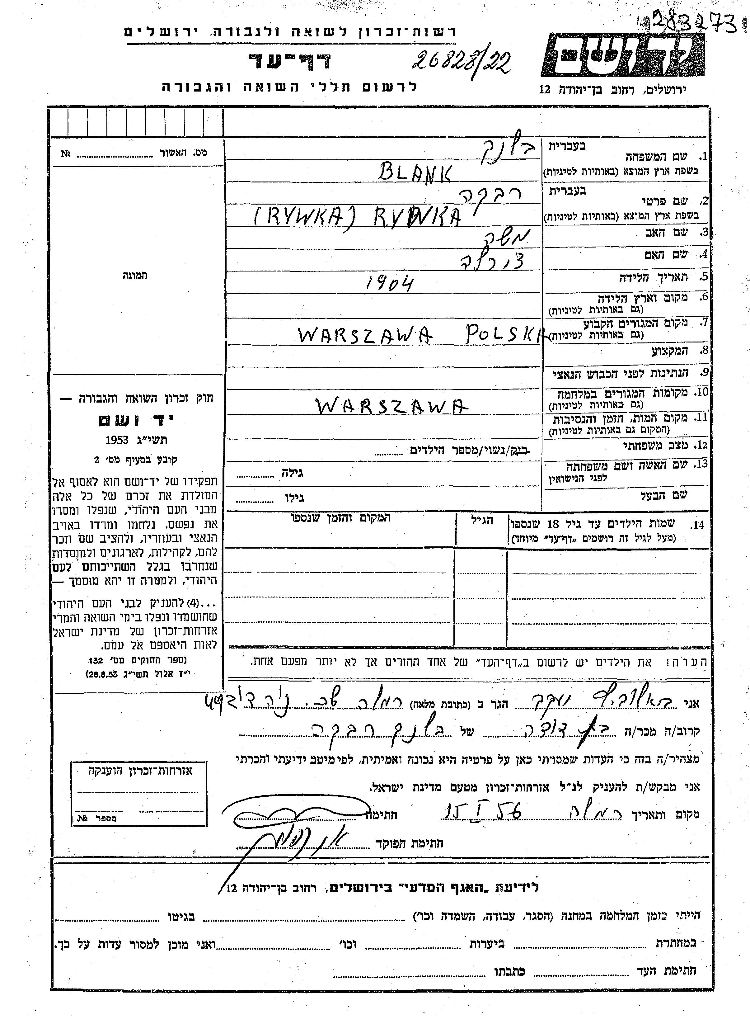 Рывка Бланк. Отец: Моше, mать:Цирла. Женат / замужем. Место жительства до войны: Варшава, Польша. Место во время войны: Варшава, Польша.