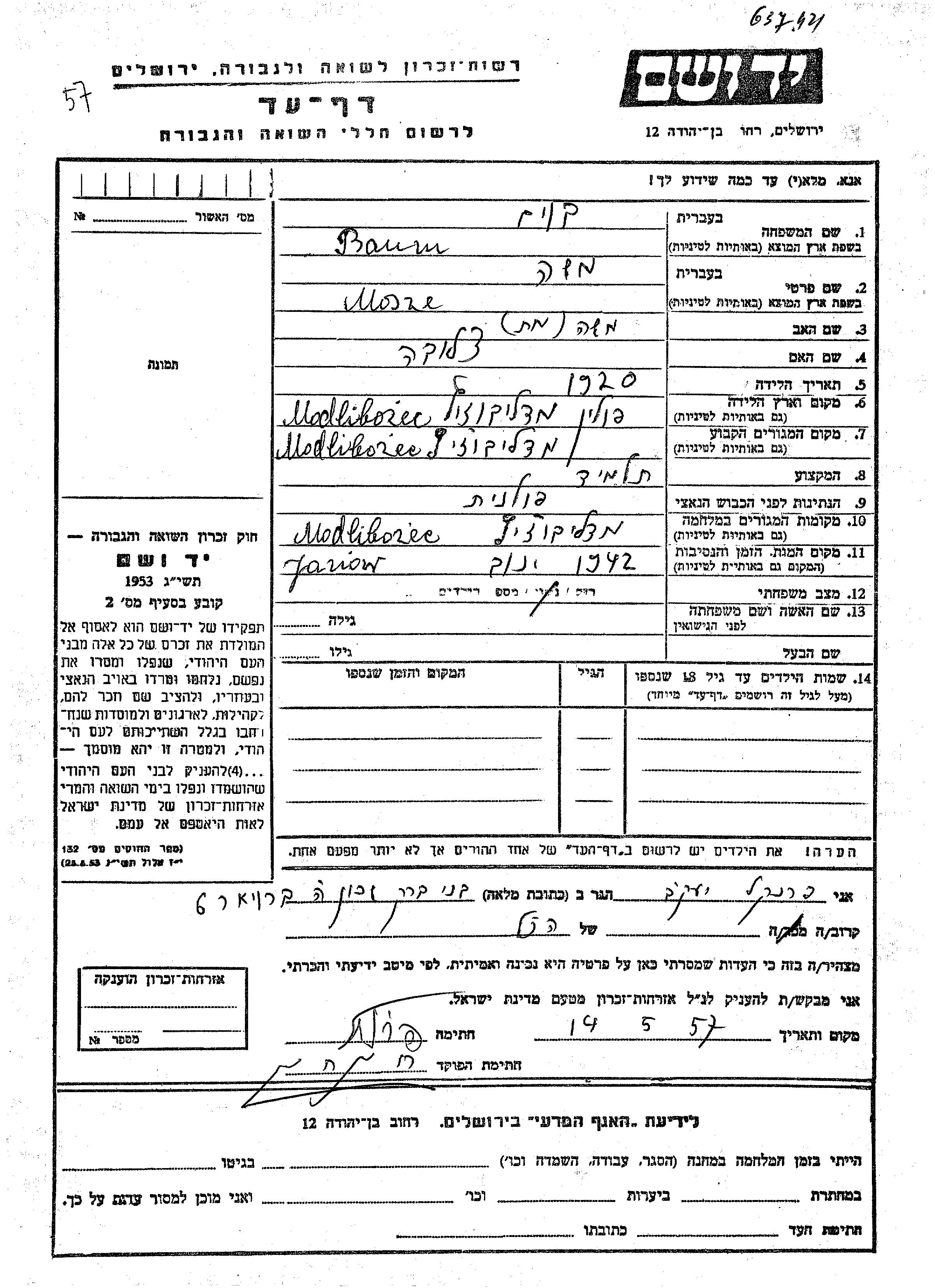 Моше Баум, место рождения: Модлибожице, Польша. Отец: Моше, mать:Цлува. Ученик / ученица. Холост / не замужем. Место жительства до войны: Модлибожице, Польша. Место во время войны: Модлибожице, Польша.