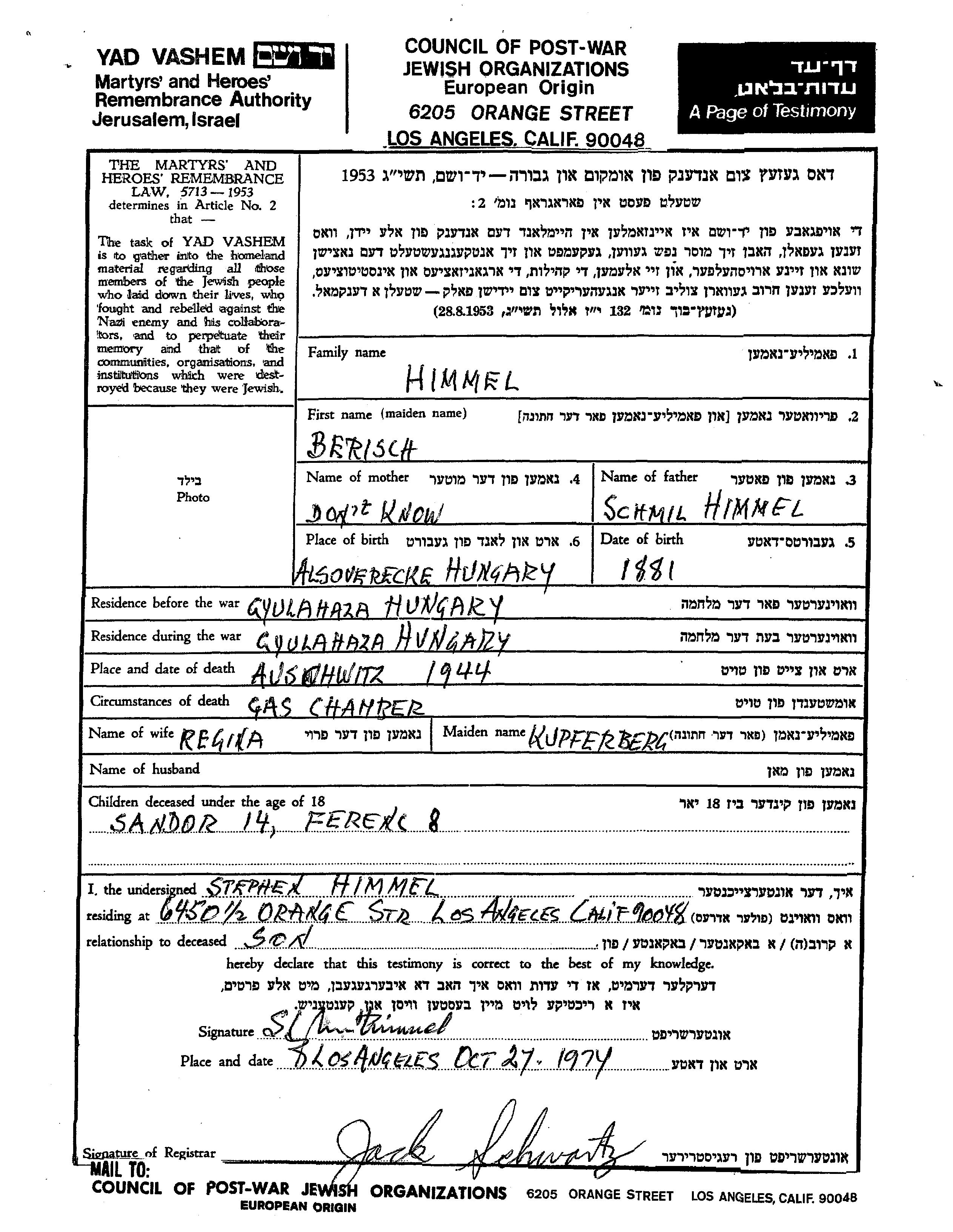 Бериш Химмель, место рождения: Альшоверецке, Чехословакия. Отец: Шмиль. Женат / замужем. Место жительства до войны: Дьюлахаза, Венгрия. Место во время войны: Дьюлахаза, Венгрия.