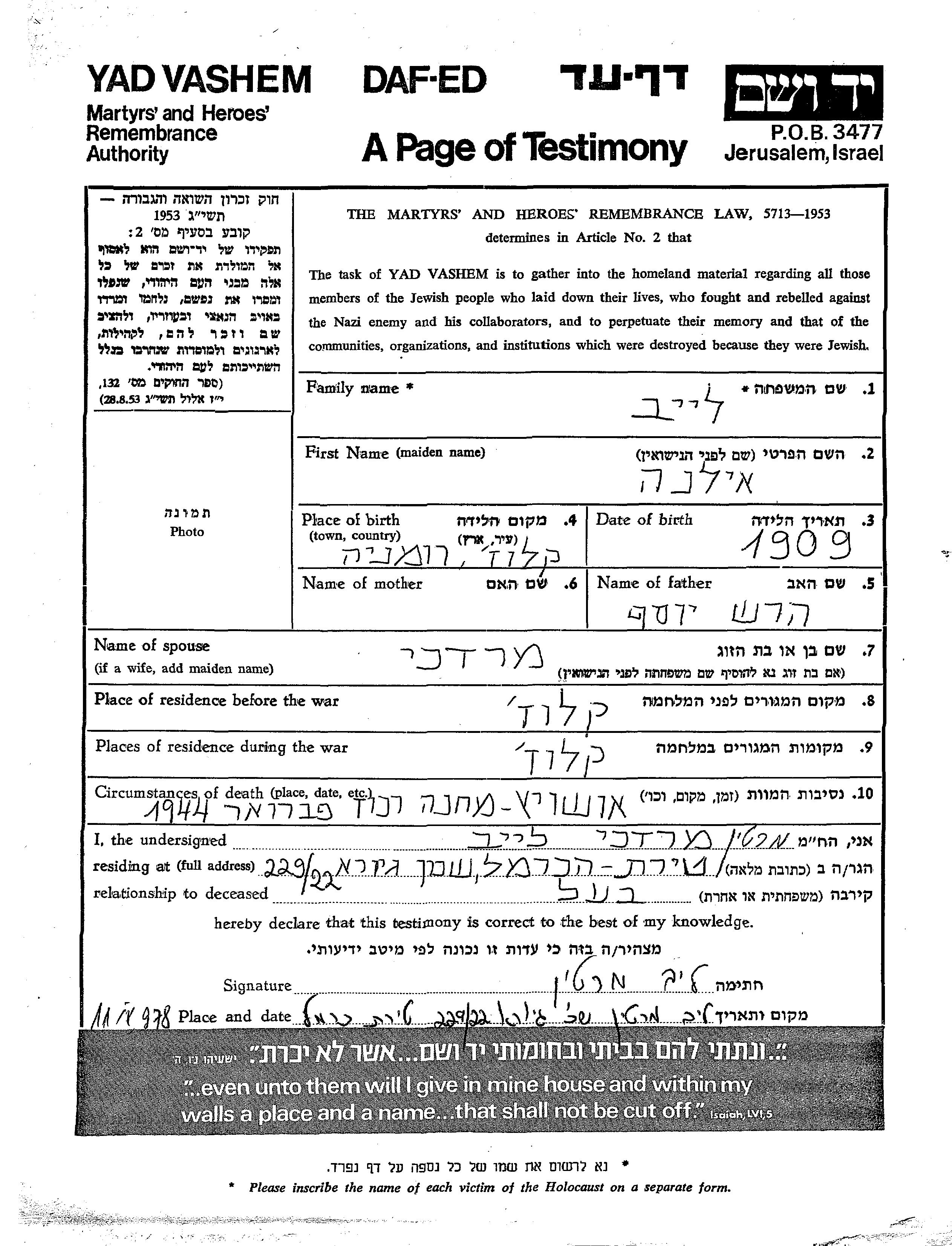 Илана Лейб, место рождения: Клуж, Румыния. Отец: Герш Иосеф. Женат / замужем. Место жительства до войны: Клуж, Румыния. Место во время войны: Клуж, Румыния.