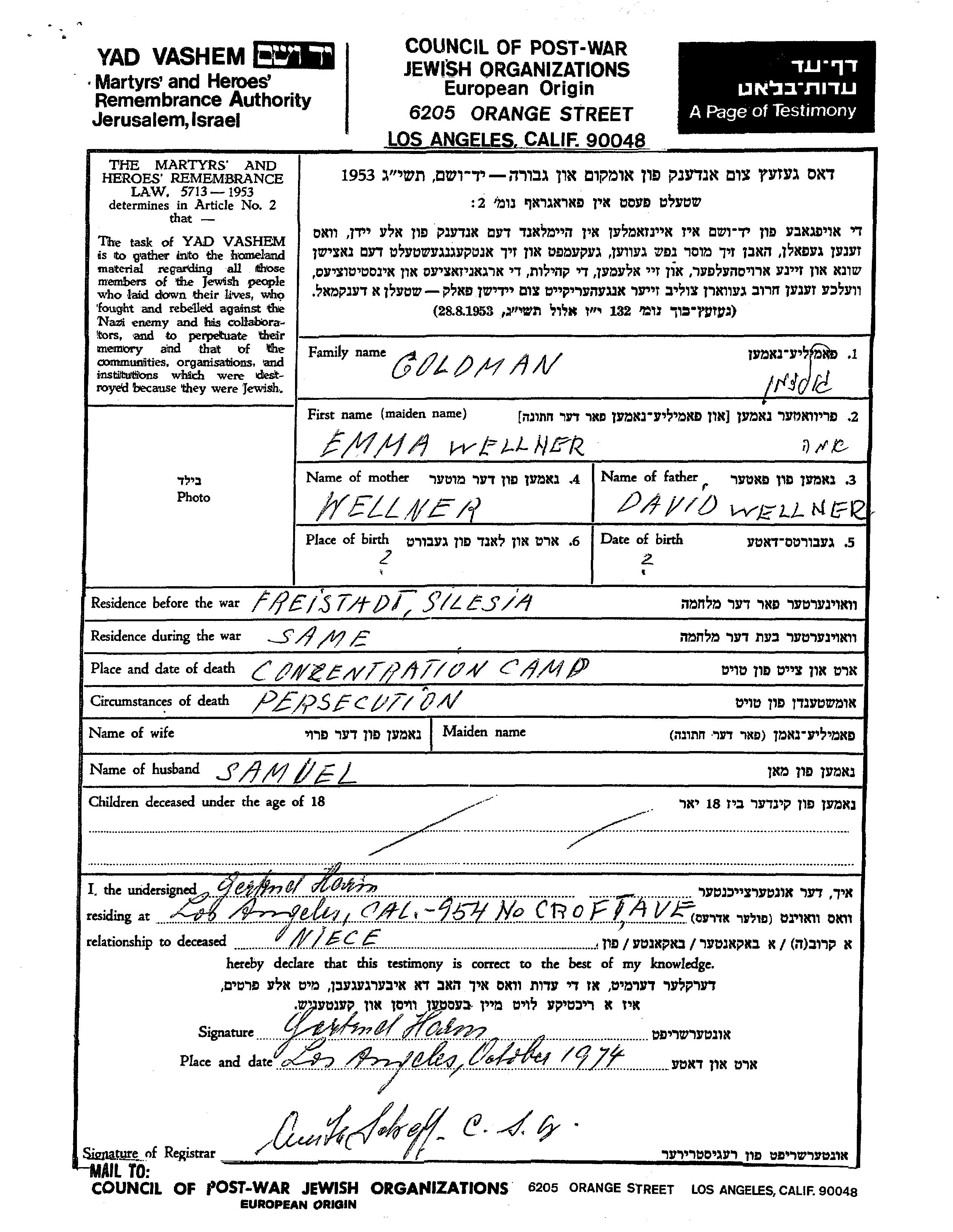 Эмма Гольдман, девичья фамилия Велльнер Давид. Женат / замужем. Место жительства до войны: Фрайштадт, Чехословакия. Место во время войны: Фрайштадт, Чехословакия.