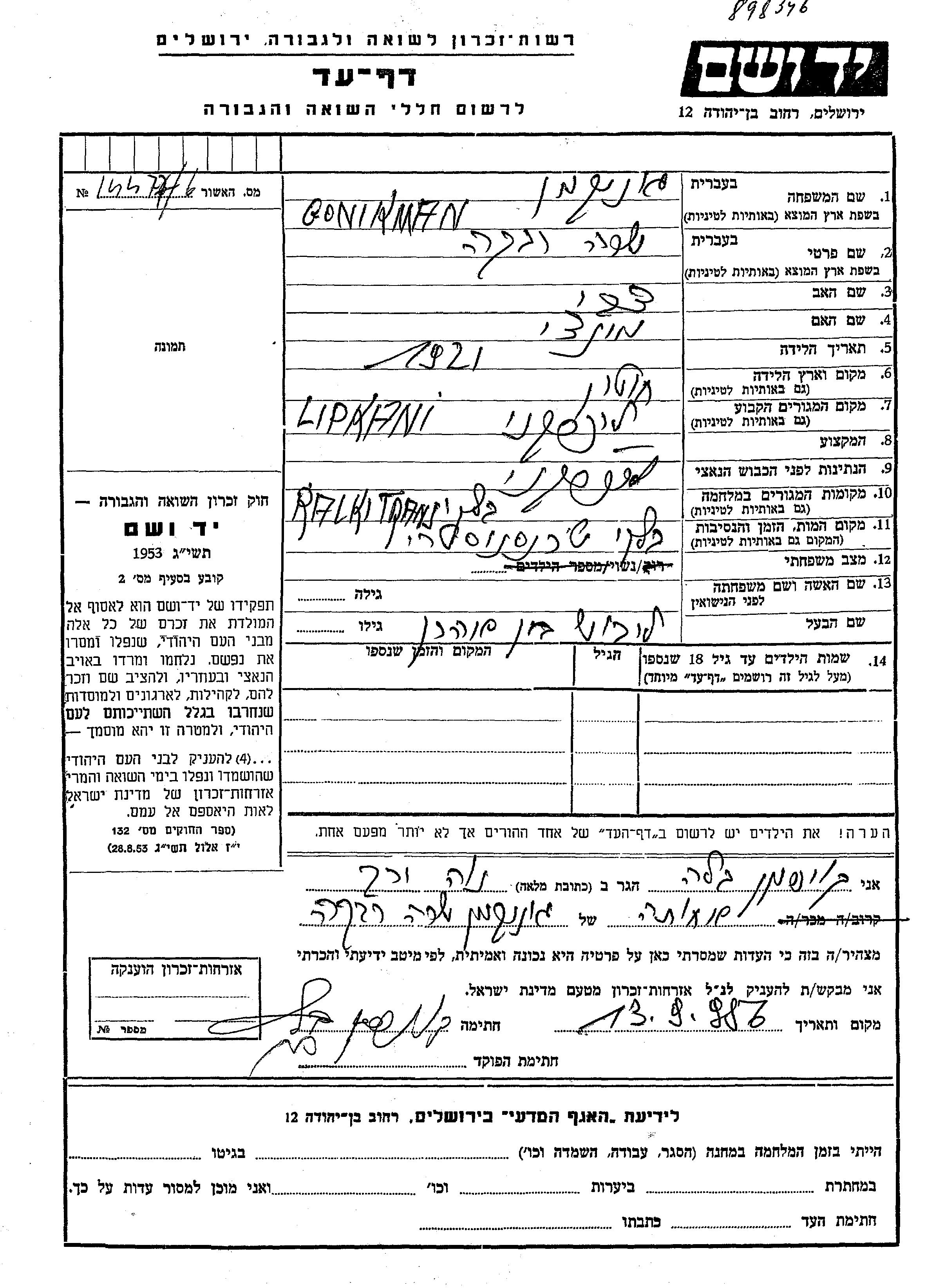Гоникман Сара Ривка 1921 Липкань, Румыния Лист свидетельских показаний