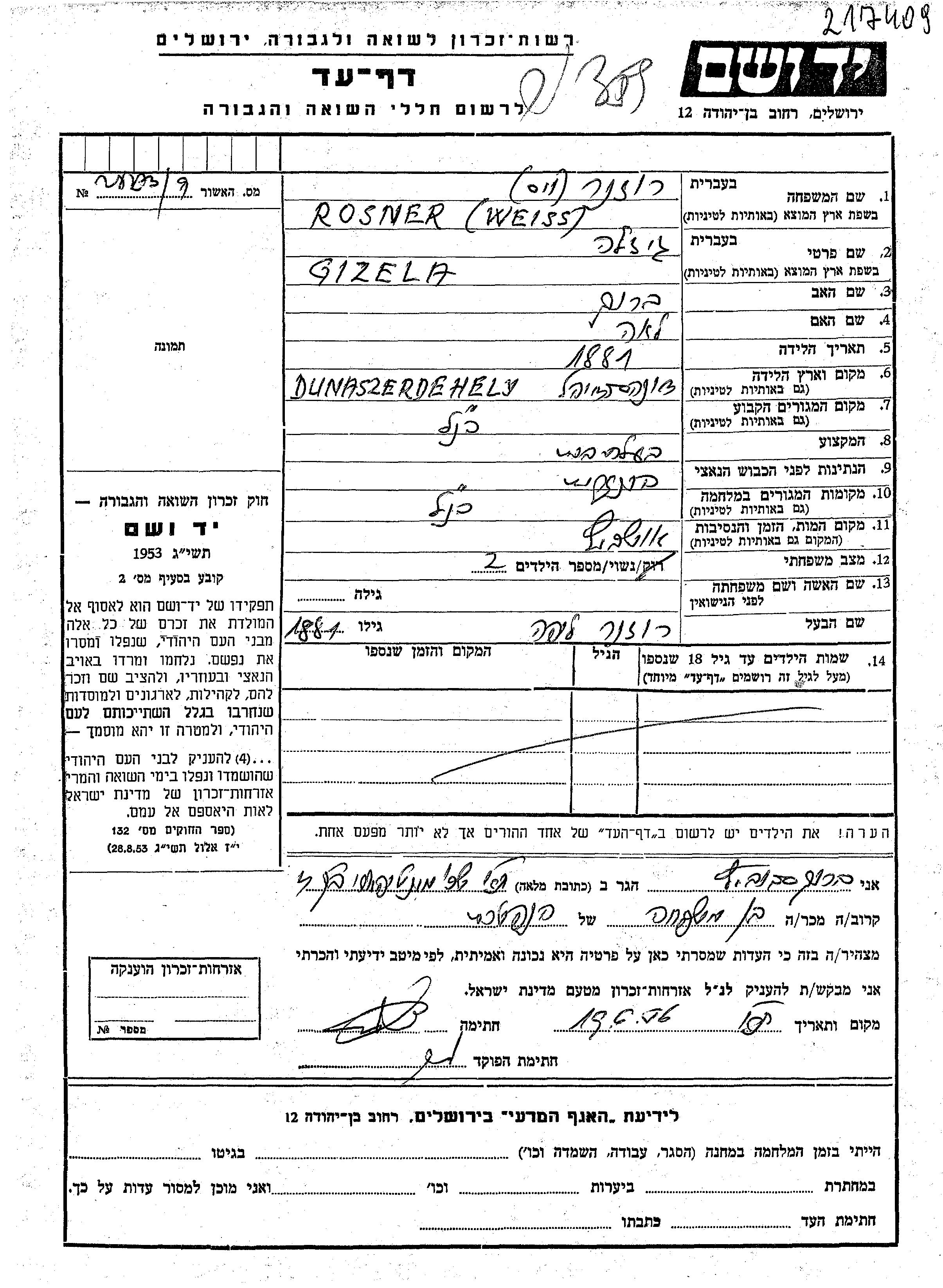 Гизела Рознер, девичья фамилия Вайсс, место рождения: Дунасердехей, Чехословакия. Отец: Барух, mать:Лея. Домохозяйка. Женат / замужем. Место жительства до войны: Дунасердехей, Чехословакия. Место во время войны: Дунасердехей, Чехословакия.