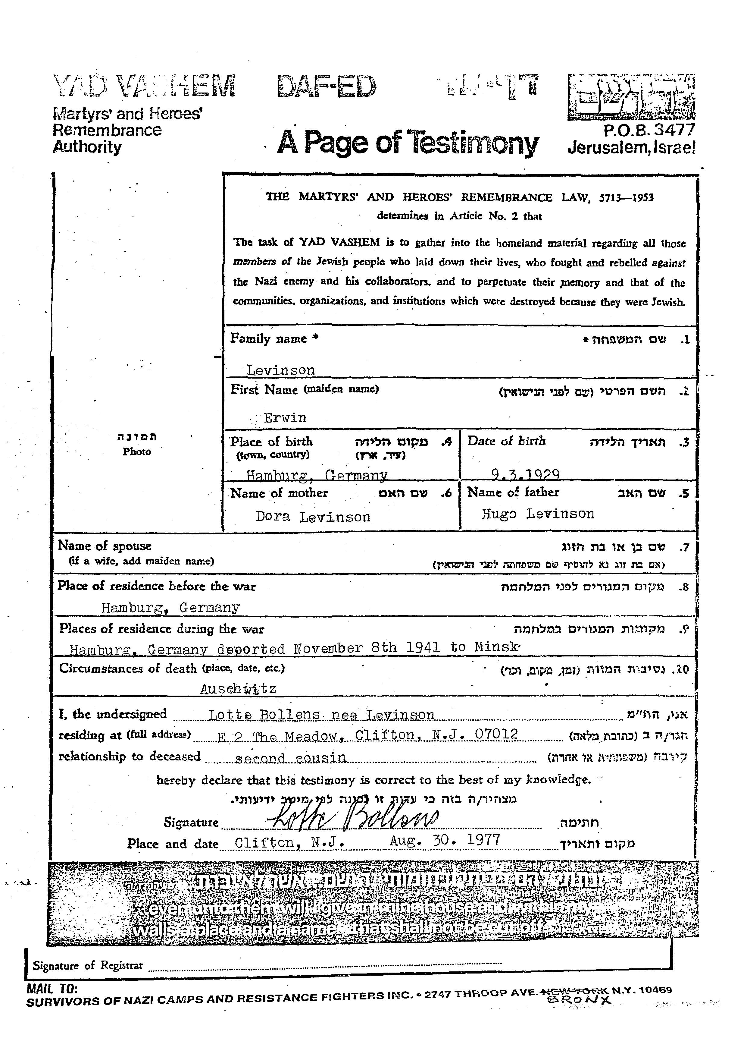 Левинсон Эрвин 1929 Гамбург, Германия Лист свидетельских показаний