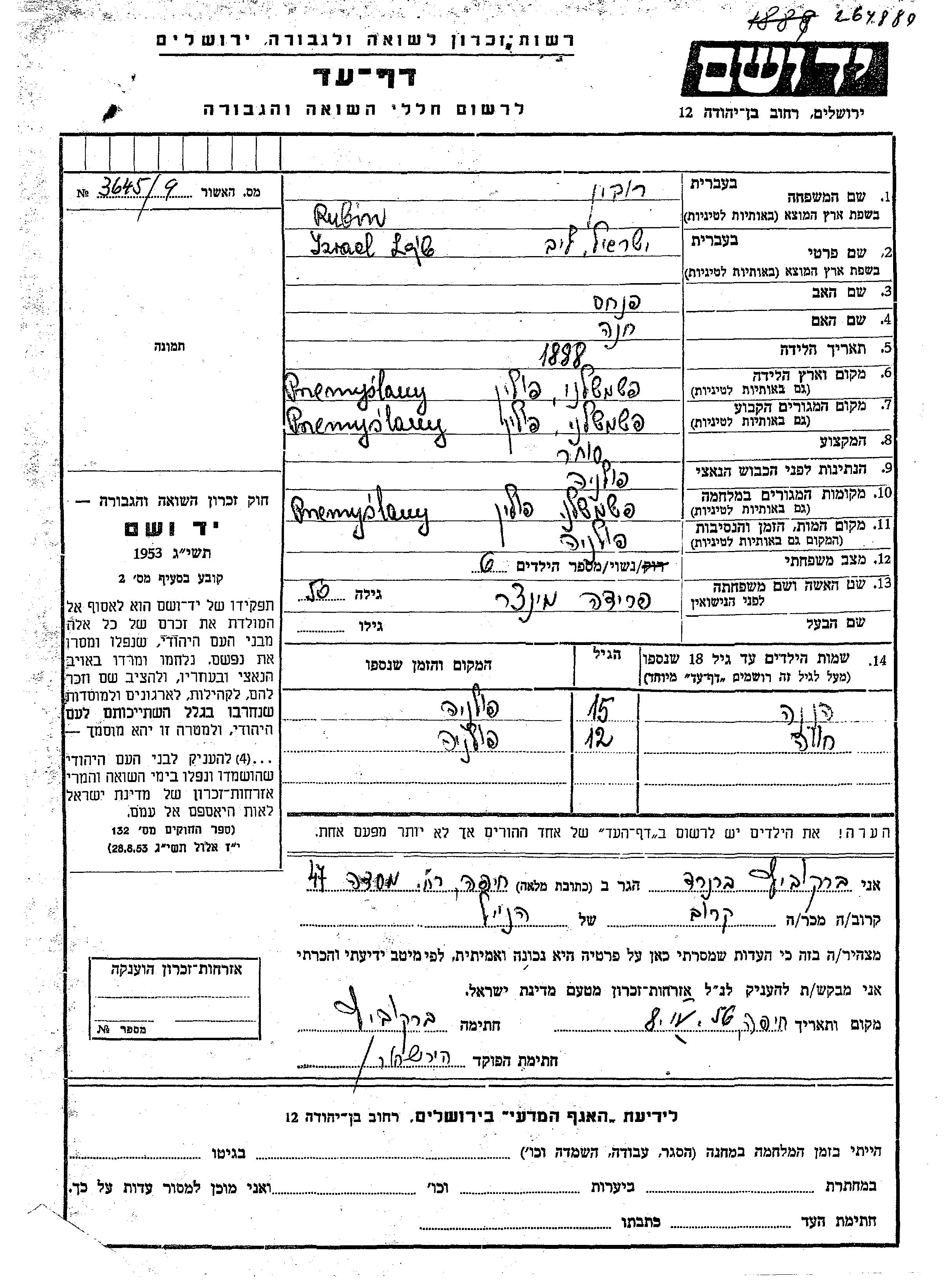 Израэль Лайб Рубин, место рождения: Перемышляны, Польша. Отец: Пинхас, mать:Хана. Торговец / торговка. Женат / замужем. Место жительства до войны: Перемышляны, Польша. Место во время войны: Перемышляны, Польша.