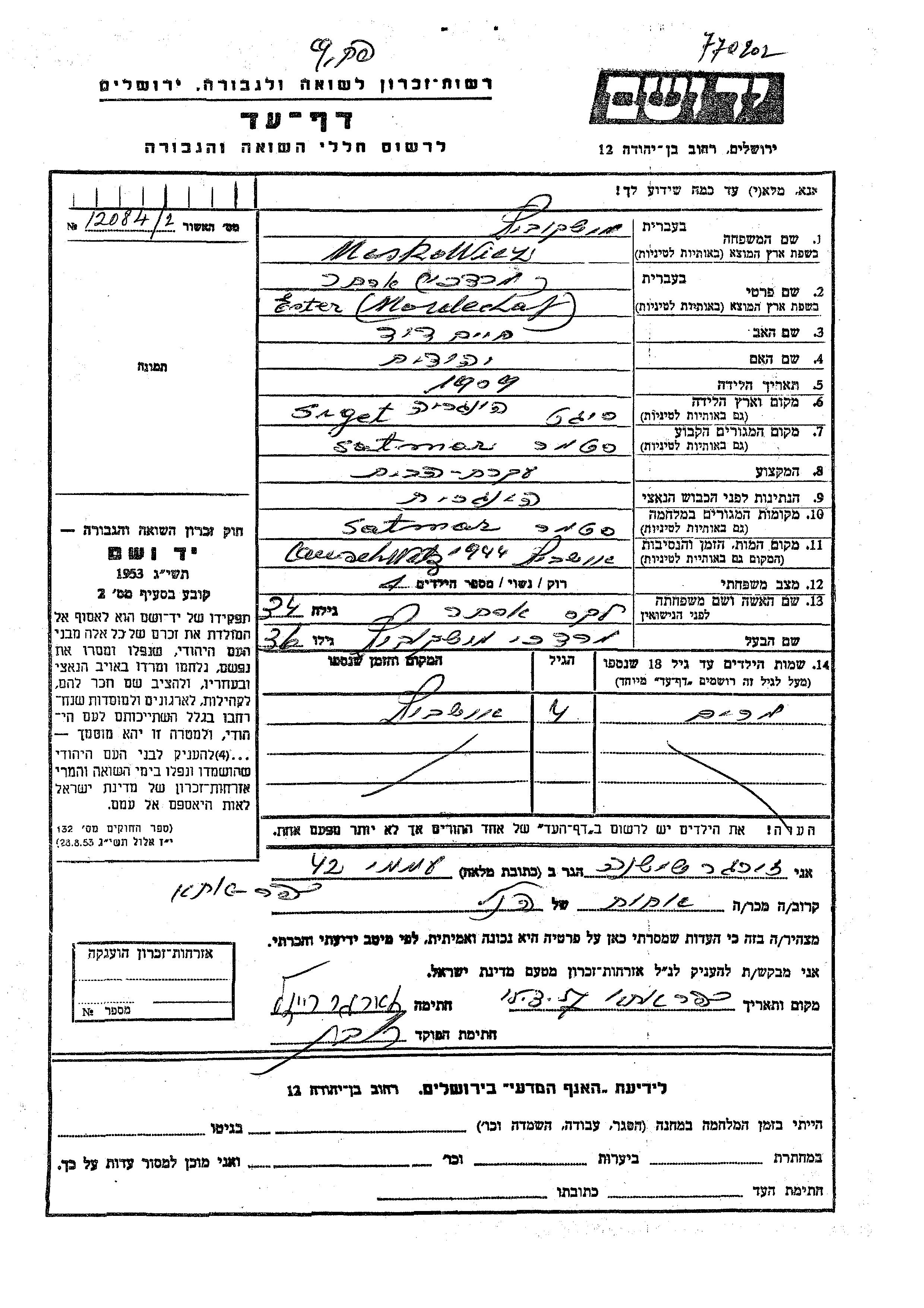 Москович Эстер 1909 Шатмар, Румыния Лист свидетельских показаний