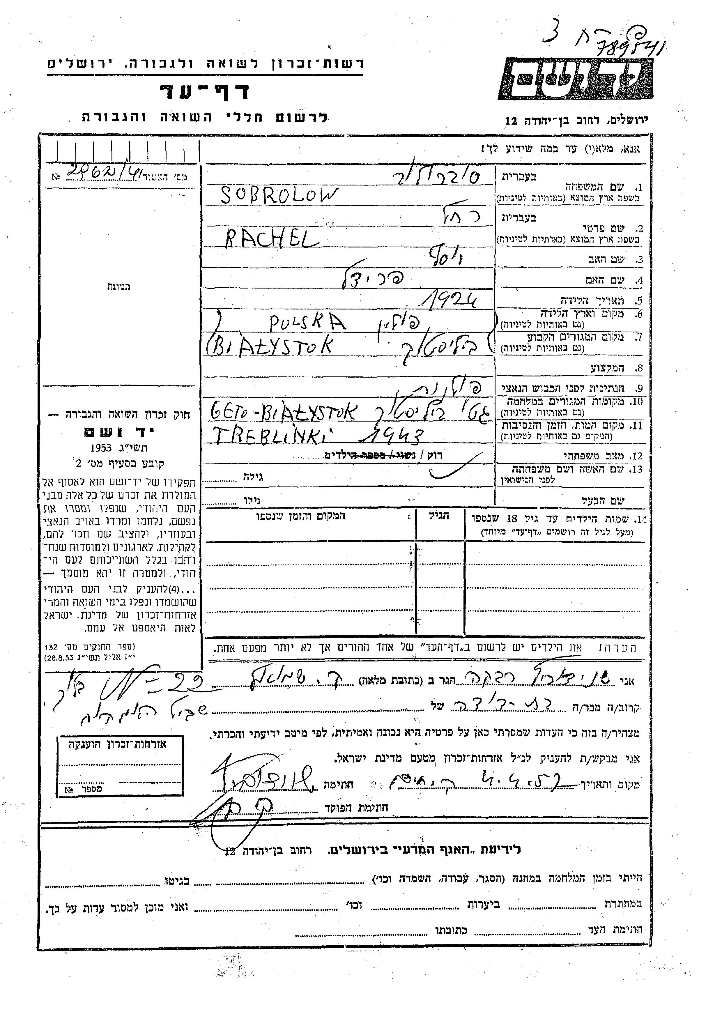 Рахель Собролов, место рождения: Польша. Отец: Иосеф, mать:Фридл. Холост / не замужем. Место жительства до войны: Белосток, Польша. Место во время войны: Белосток, Польша.