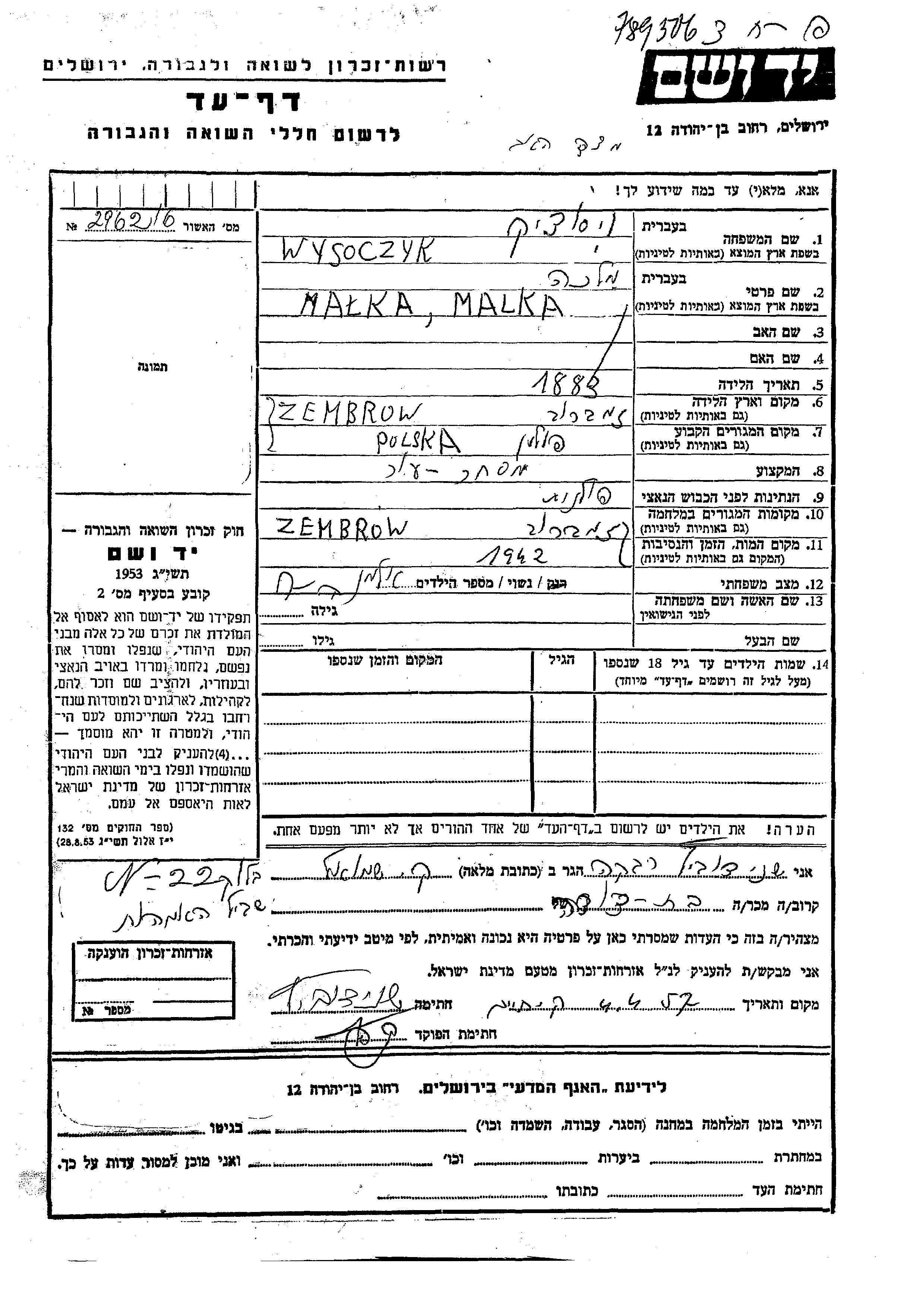 Малка Высочык, место рождения: Замбрув, Польша. Торговец кожами. Вдова. Место жительства до войны: Замбрув, Польша. Место во время войны: Замбрув, Польша.