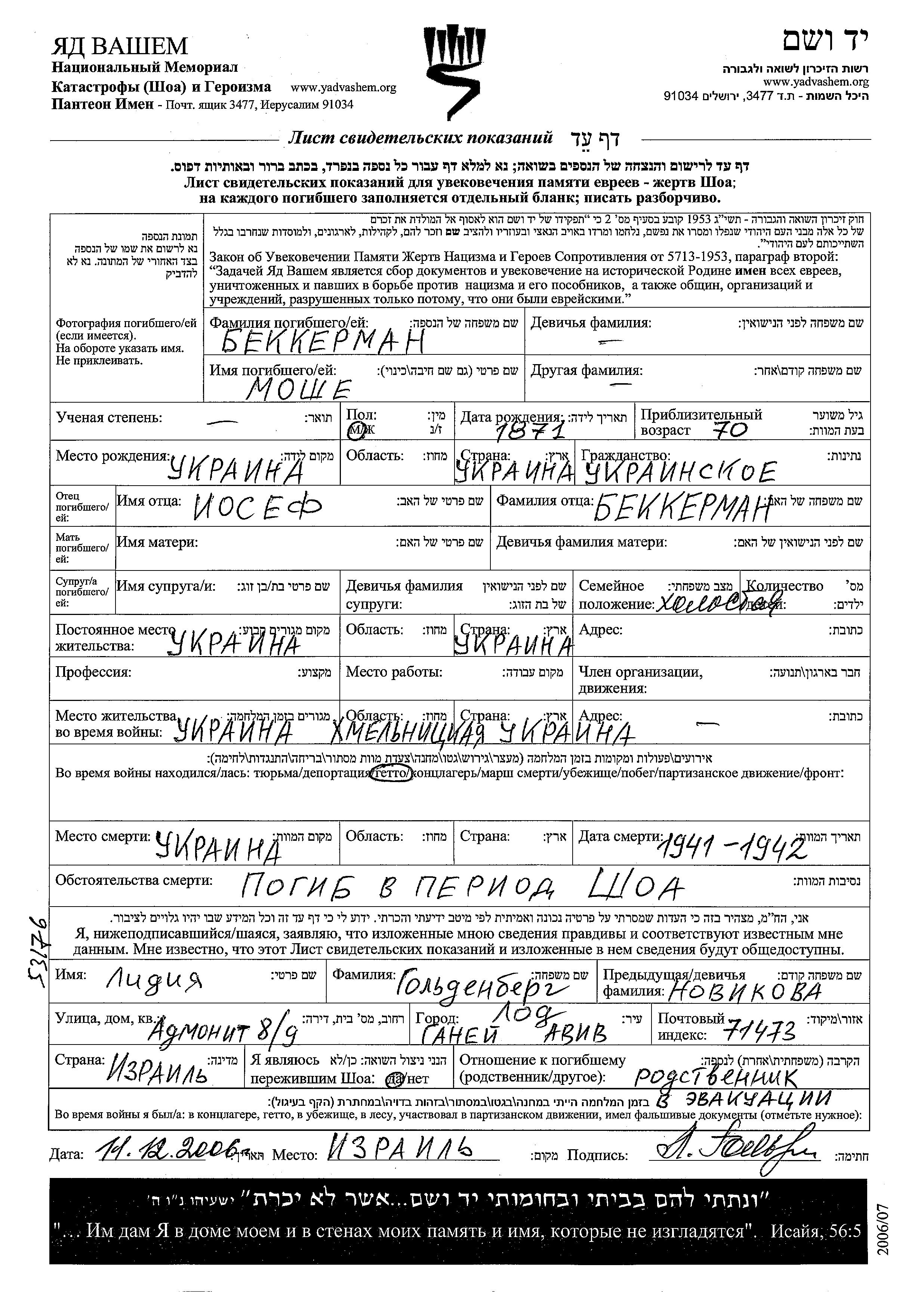 Моше Беккерман, место рождения: Украина (СССР). Отец: Иосеф. Холост / не замужем. Место жительства до войны: Каменец-Подольская Обл., Украина (СССР). Место во время войны: Каменец-Подольская Обл., Украина (СССР).