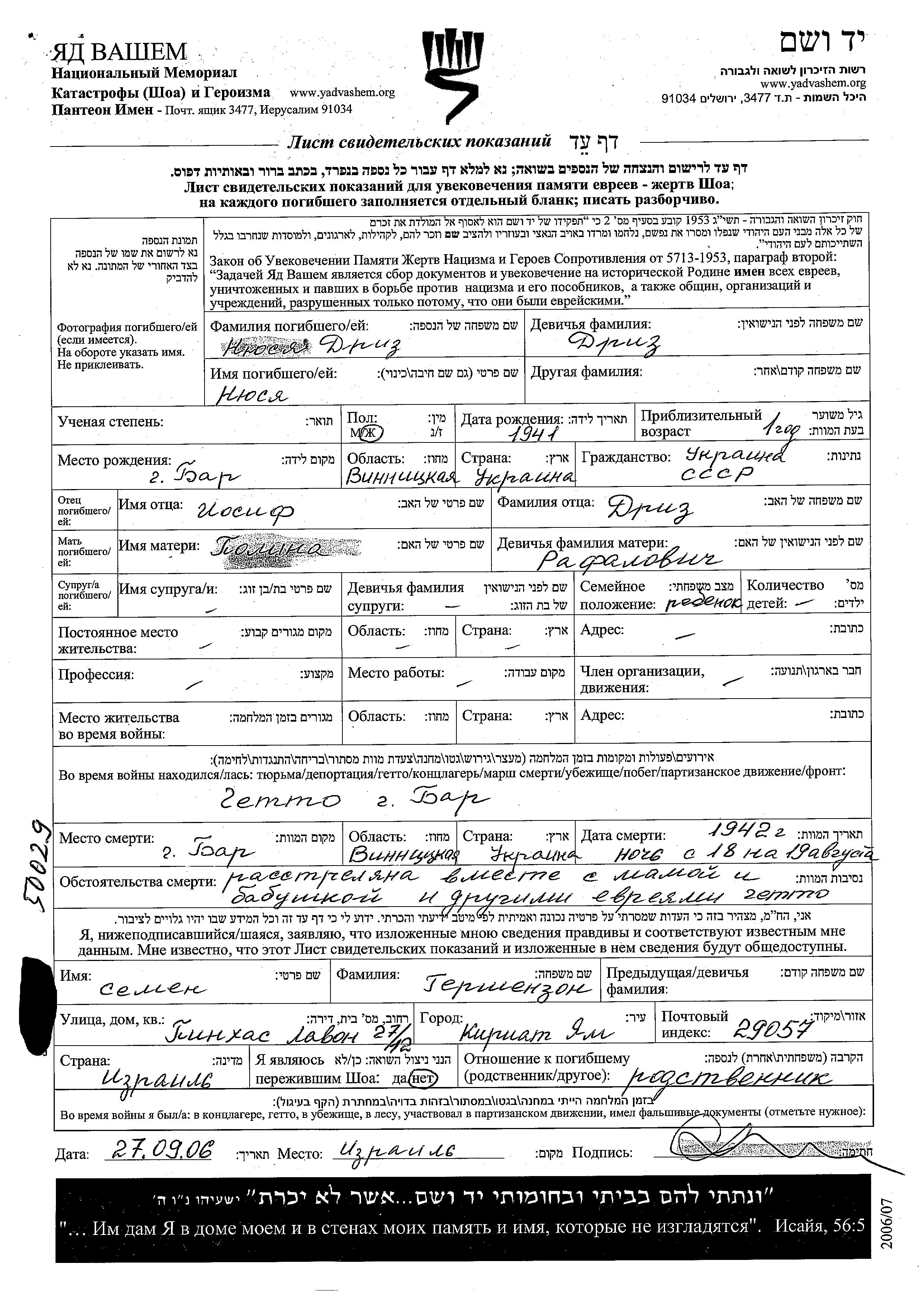 Нюся Дриз, место рождения: Бар, Украина (СССР). Отец: Иосиф, mать:Полина, девичья фамилия Рафалович. Младенец. Место во время войны: Бар, Украина (СССР).