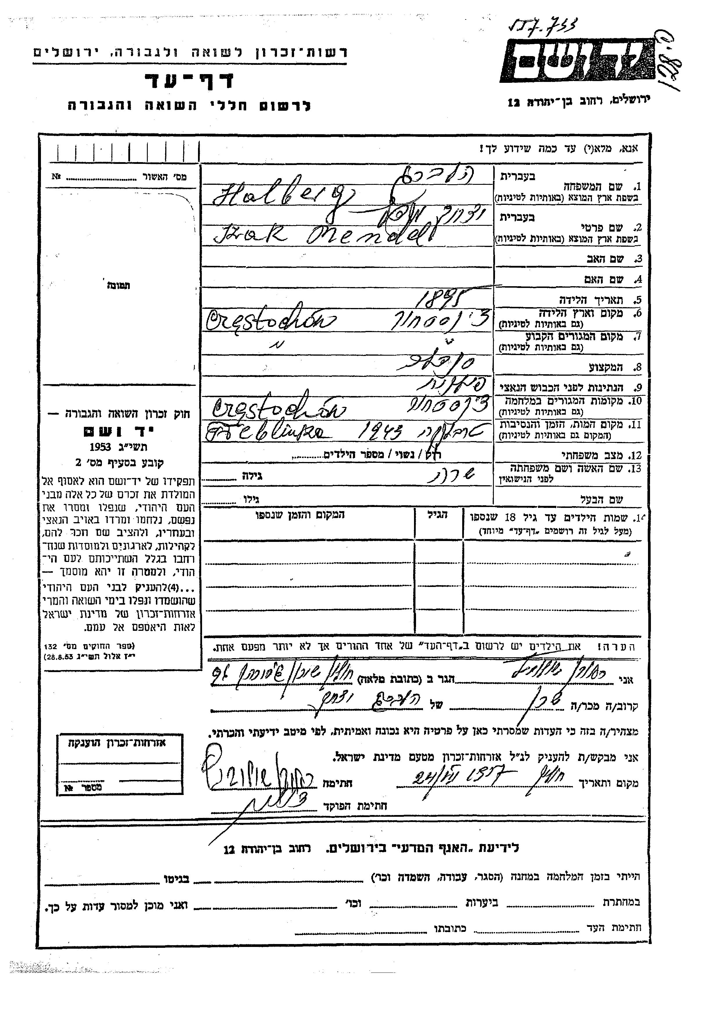 Хольберг Хельберг Изак Мендель 1895 Ченстохов, Польша Лист свидетельских показаний
