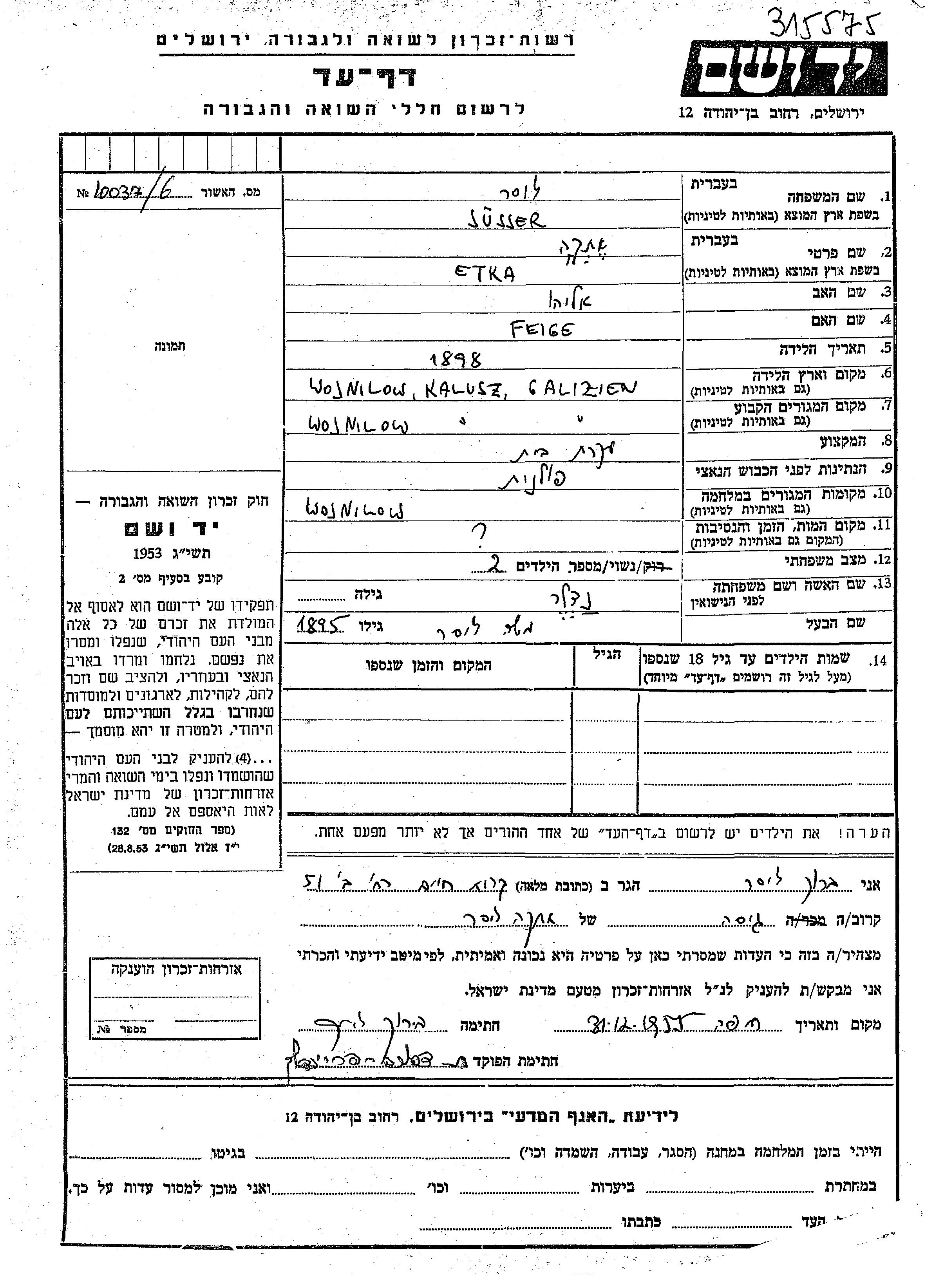 Зюсер Зусер Этка 1898 Войнилов, Польша Лист свидетельских показаний
