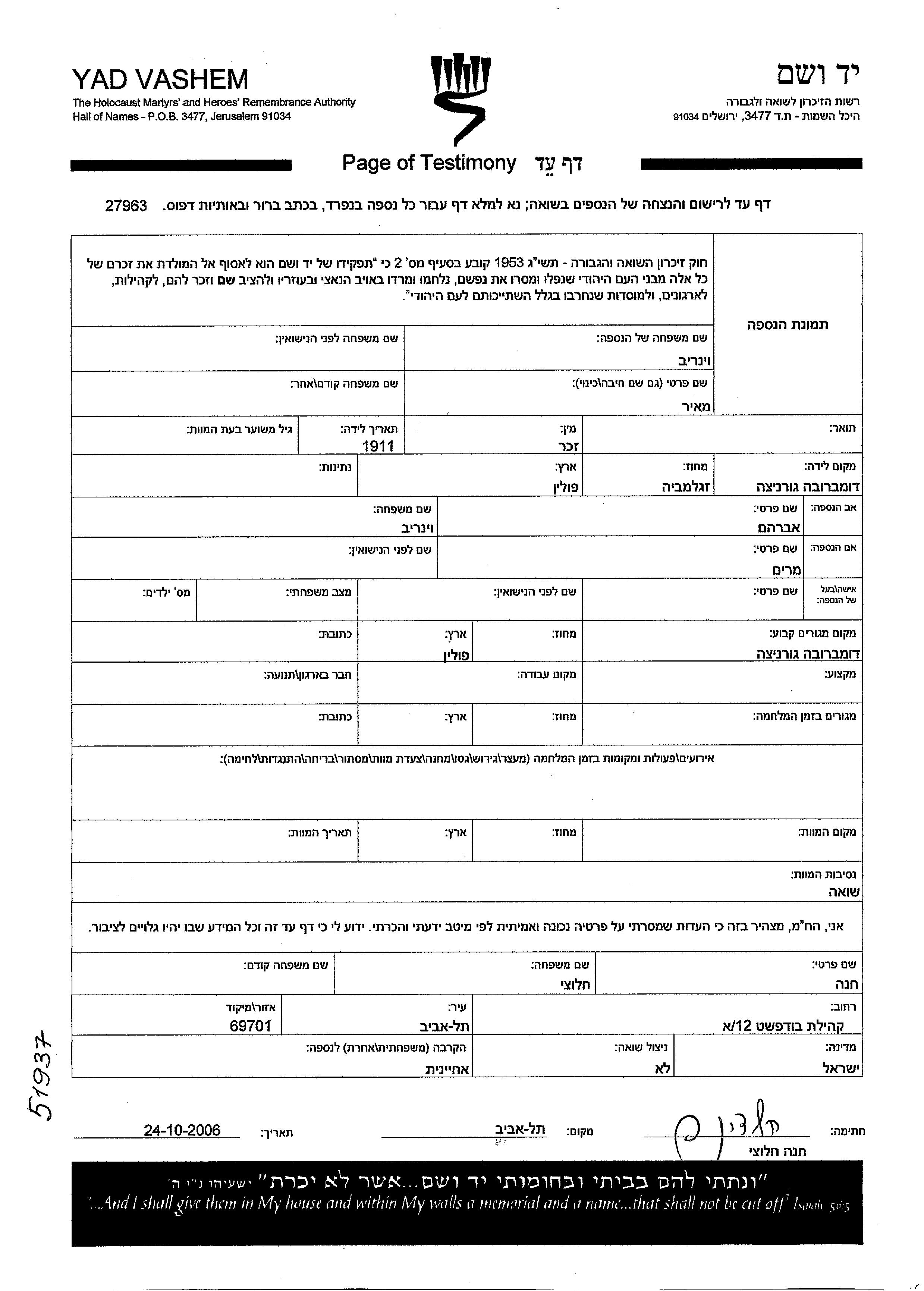 Вейнриб Меир 1911 Домброва-Гурнича, Польша Лист свидетельских показаний (электронный, с подписью)