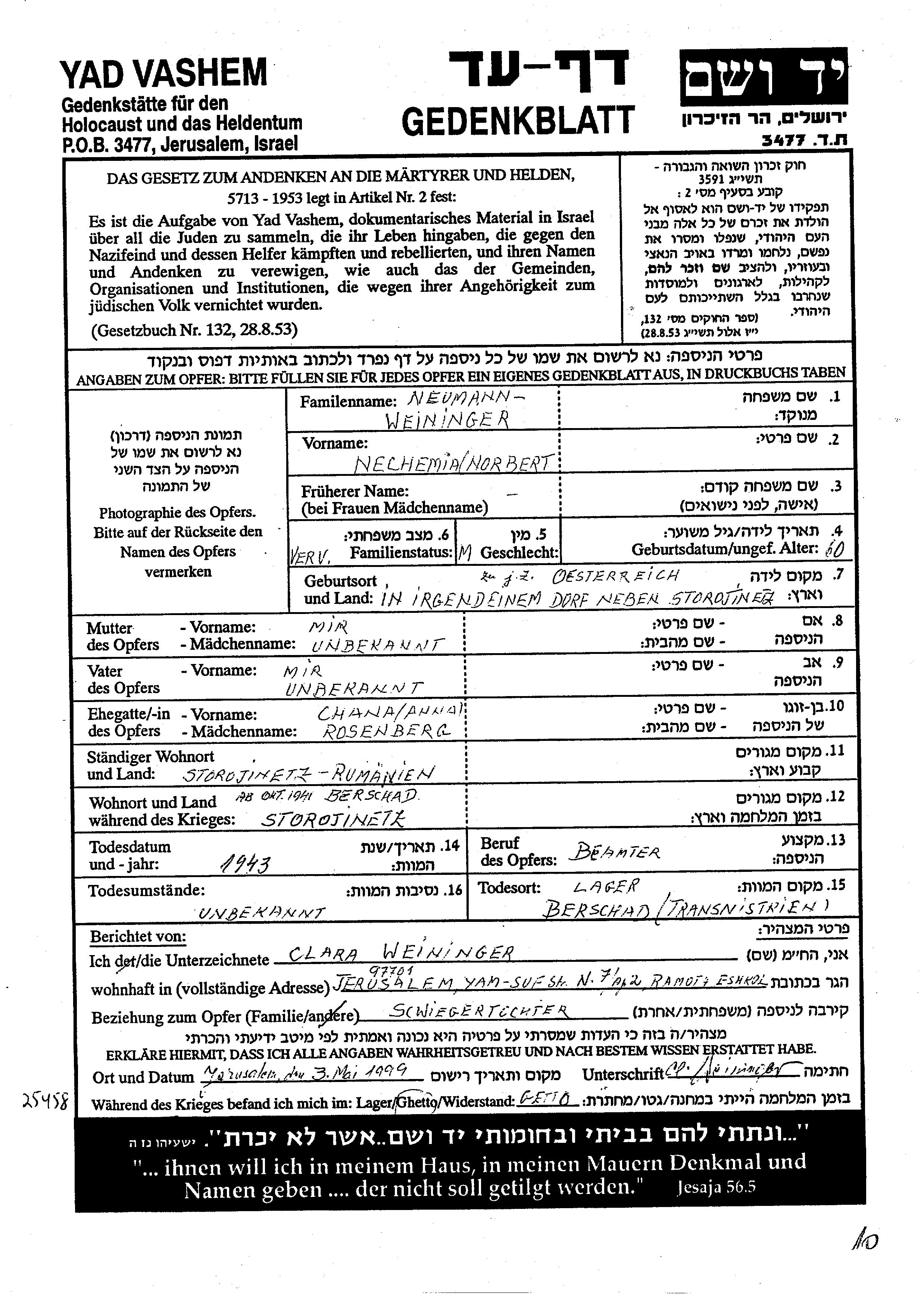 Нехемия Норберт Вейнингер Нойманн, место рождения: Сторожинец, Румыния. Государственный служащий. Женат / замужем. Место жительства до войны: Сторожинец, Румыния. Место во время войны: Бершадь, Украина (СССР).