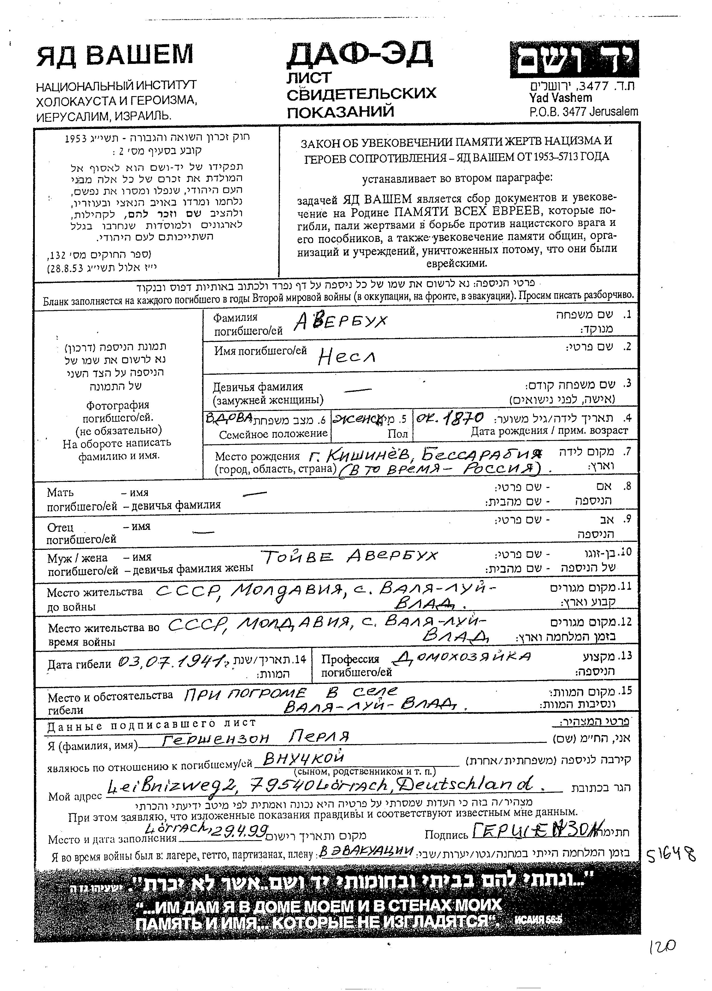 Несль Авербух, место рождения: Кишинёв, Румыния. Домохозяйка. Вдова. Место жительства до войны: Валя-Луй-Влад, Румыния. Место во время войны: Валя-Луй-Влад, Румыния.