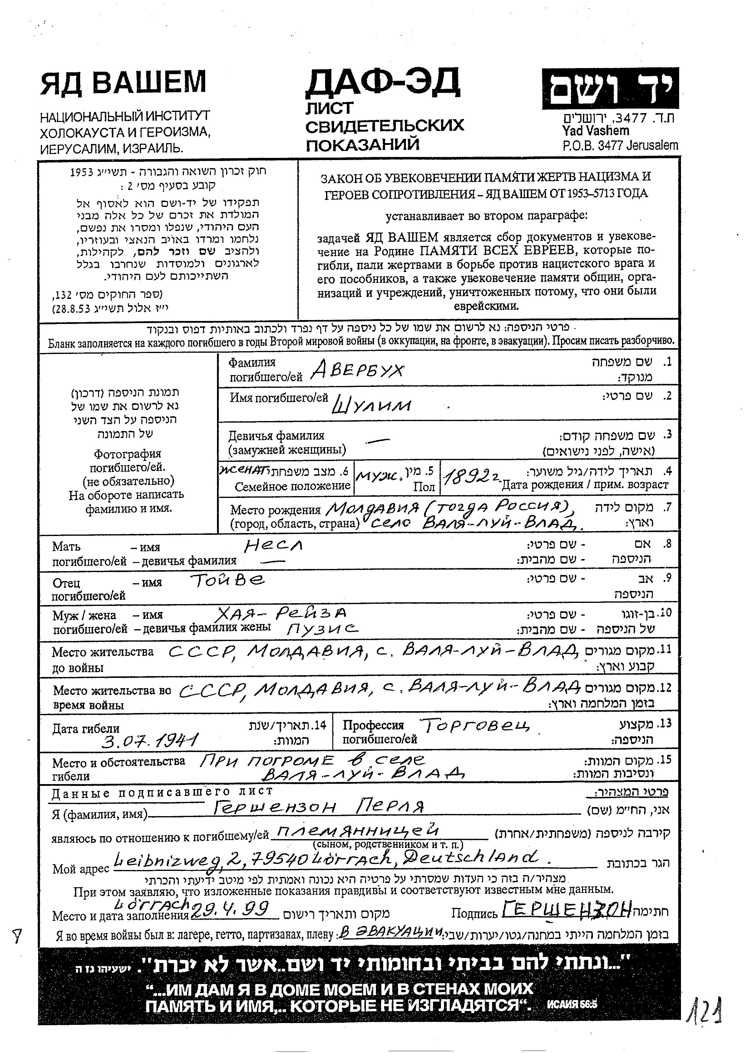 Авербух Шулим 1892 Валя-Луй-Влад, Румыния Лист свидетельских показаний