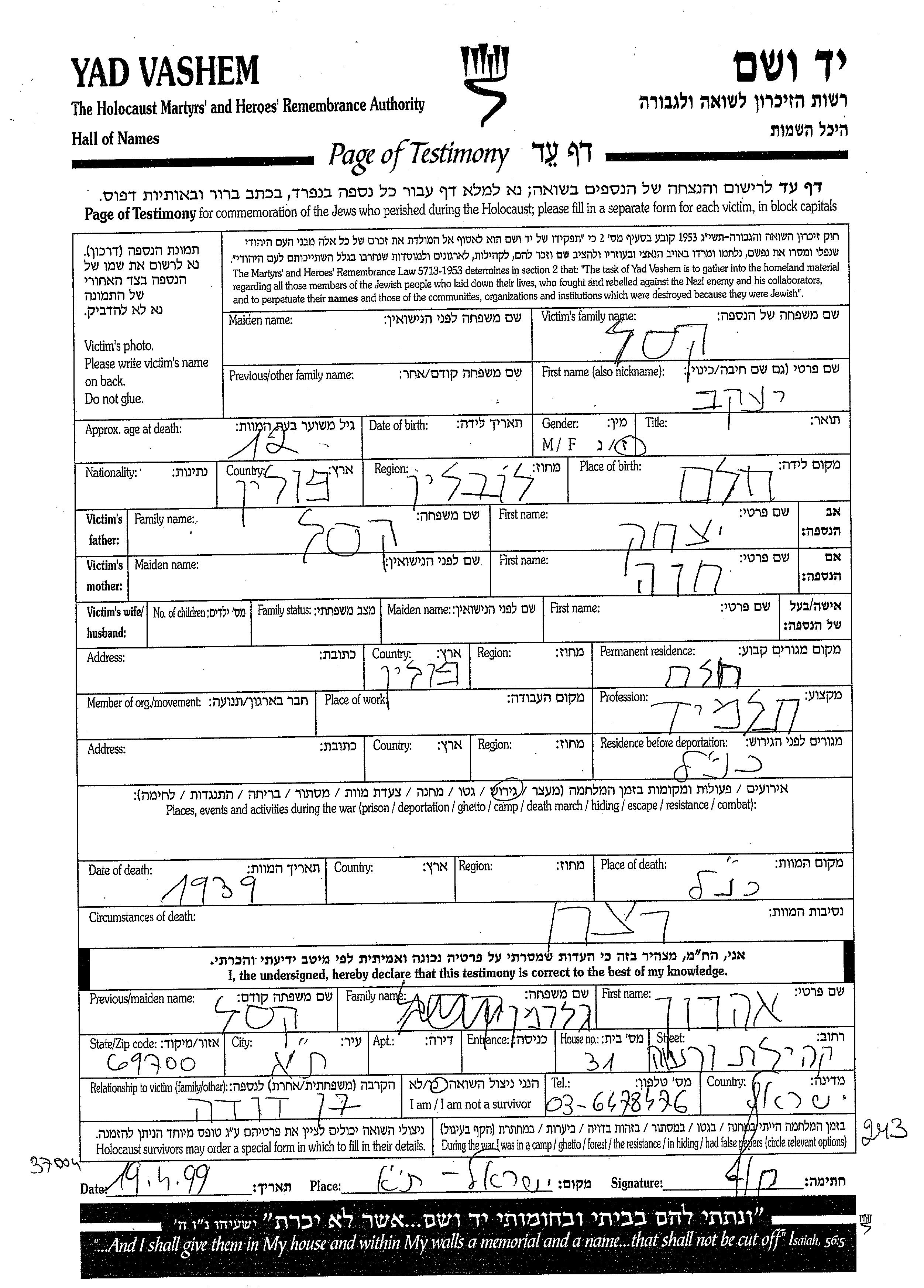 Касель Яков Хелм, Польша Лист свидетельских показаний