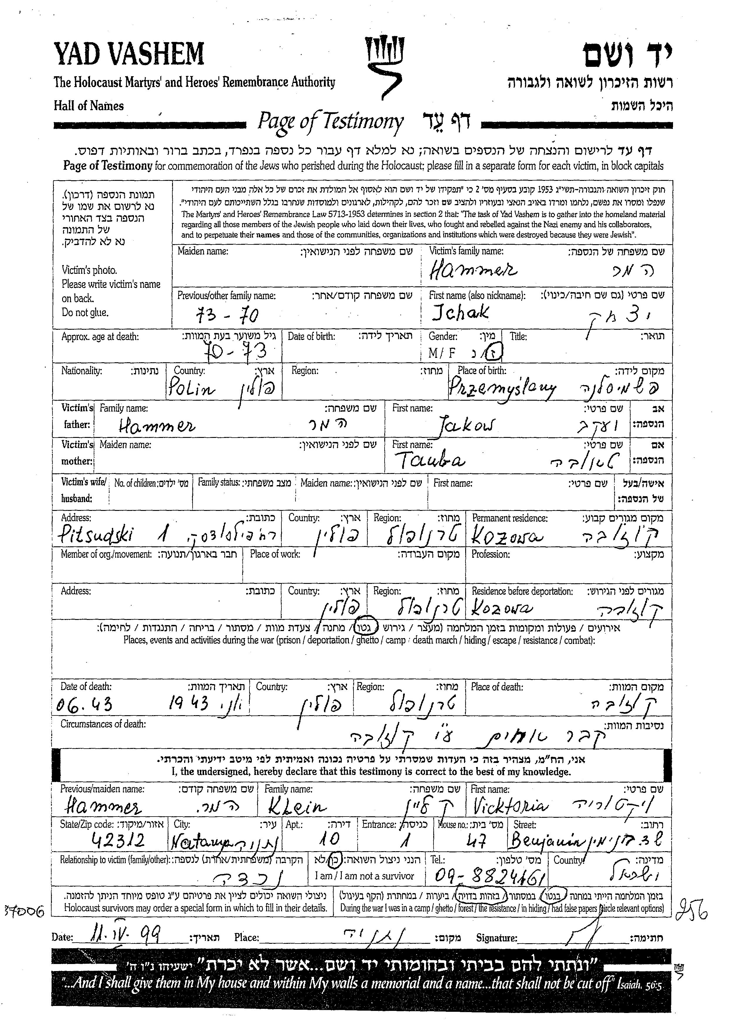 Ицхак Хаммер, место рождения: Перемышляны, Польша. Отец: Яков, mать:Тауба. Место жительства до войны: Козова, Польша. Место во время войны: Козова, Польша.