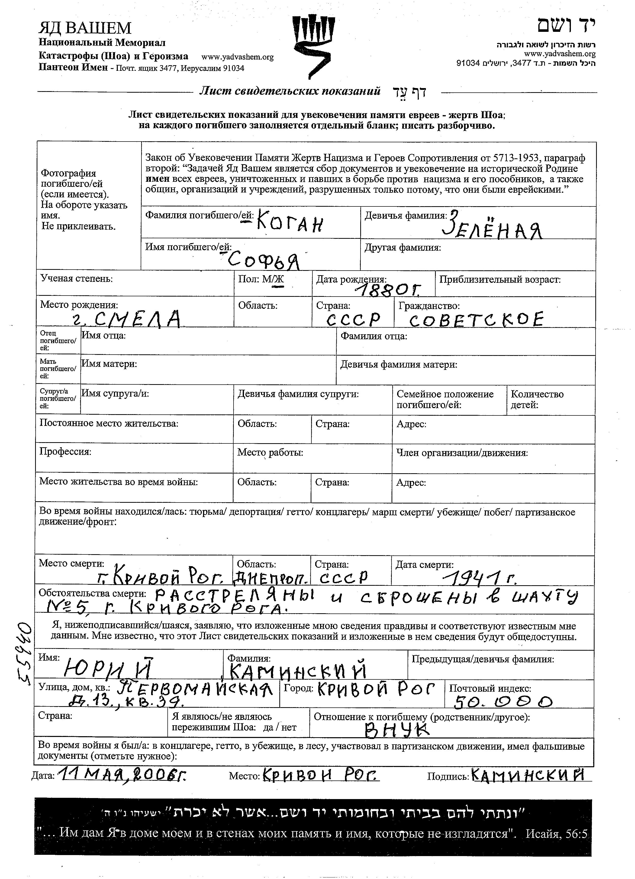 Яд Вашем - Листы свидетельских показаний Мемориального фонда