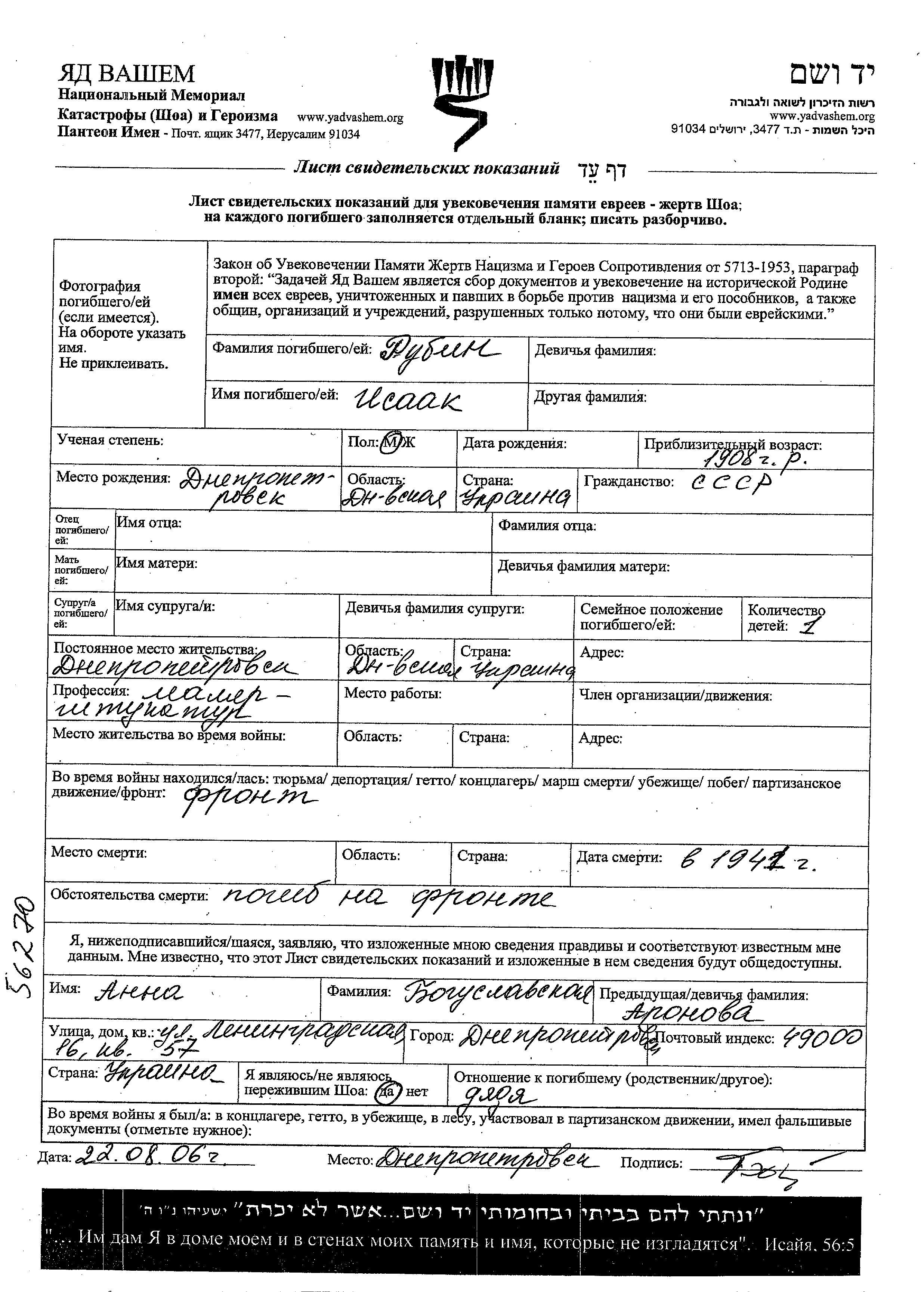 Рубин Исаак 1908 Днепропетровск, Украина (СССР) Лист свидетельских показаний