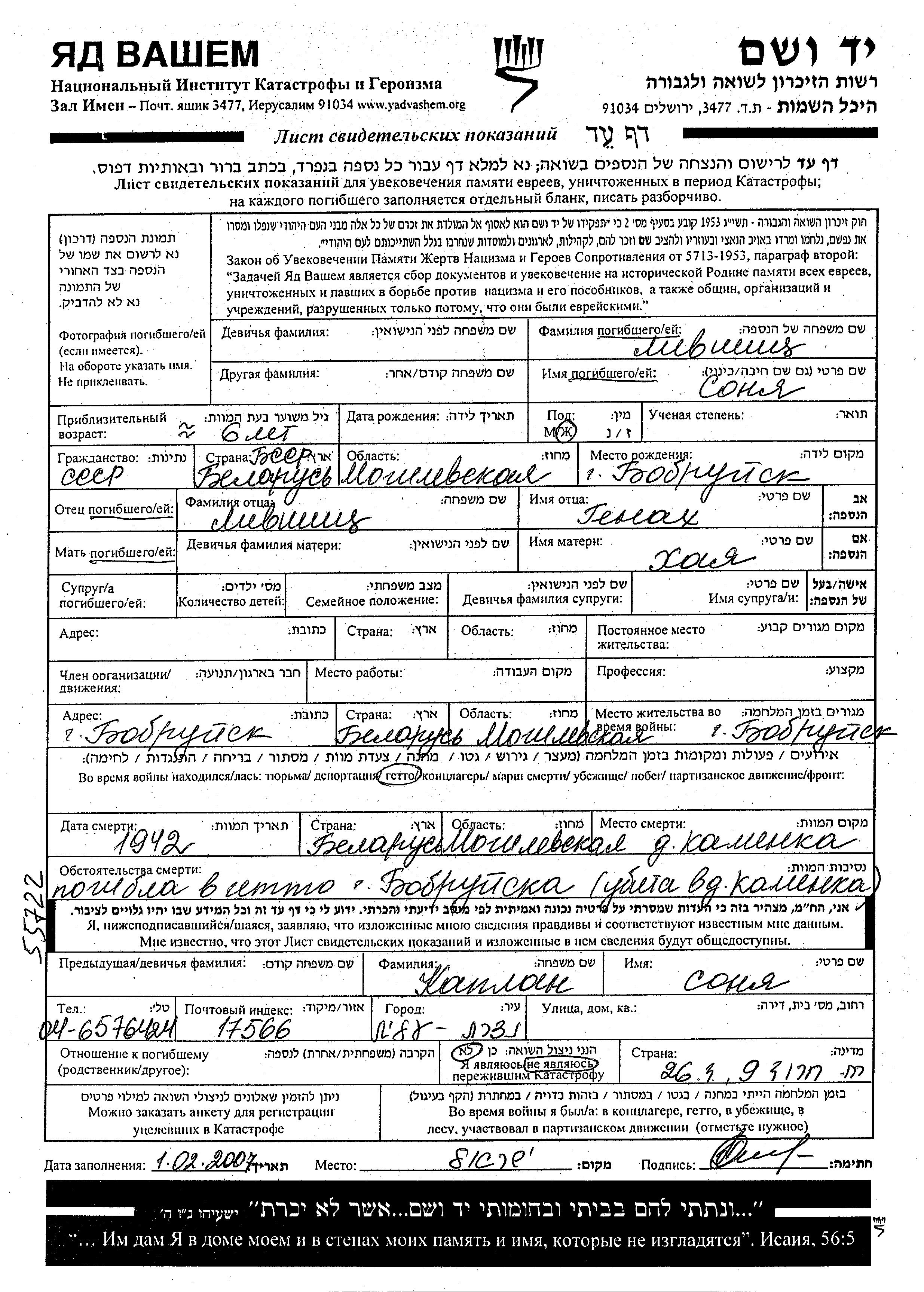Лившиц Соня место не указано, Лист свидетельских показаний