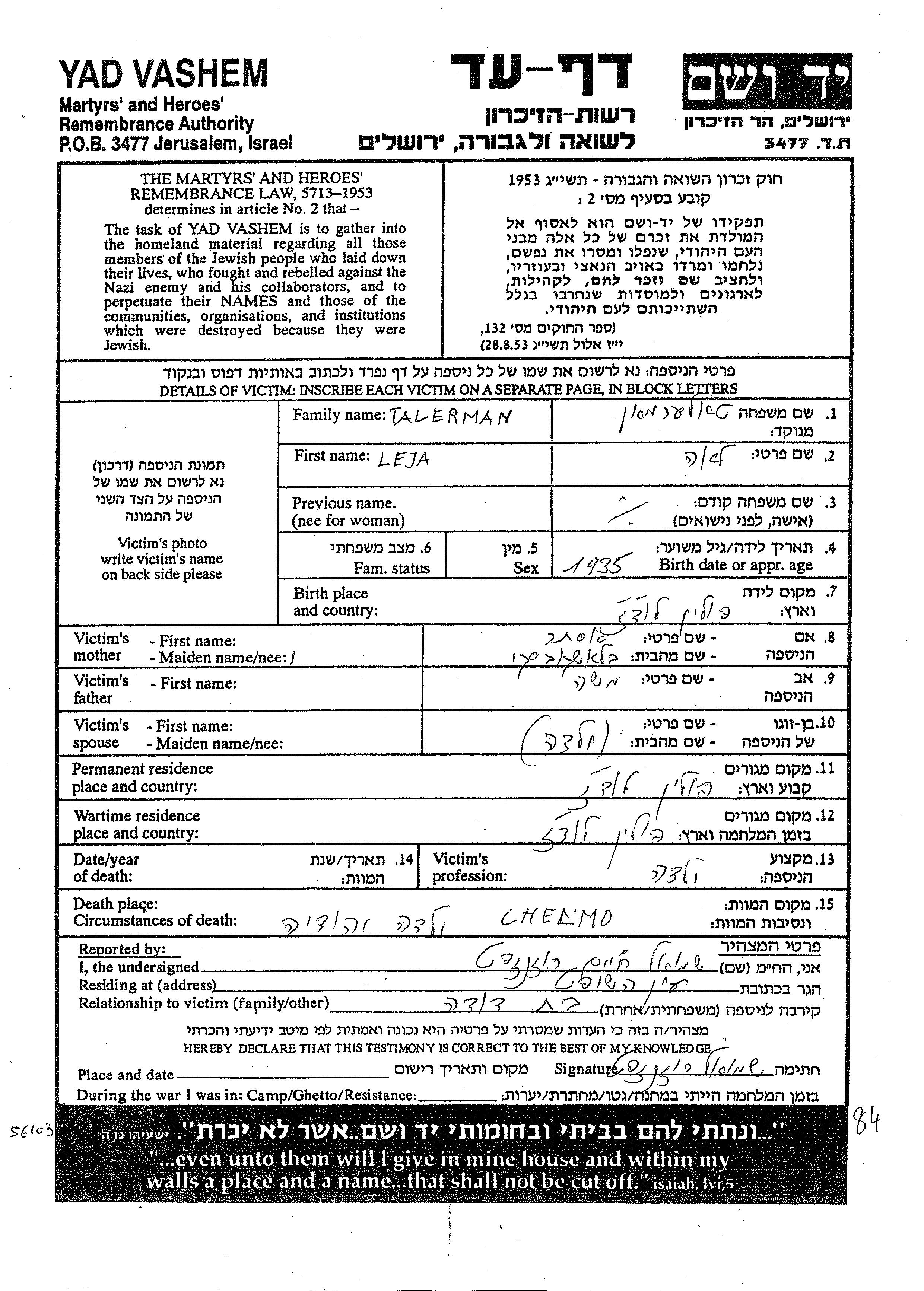 Талерман Лея 1935 Лодзь, Польша Лист свидетельских показаний