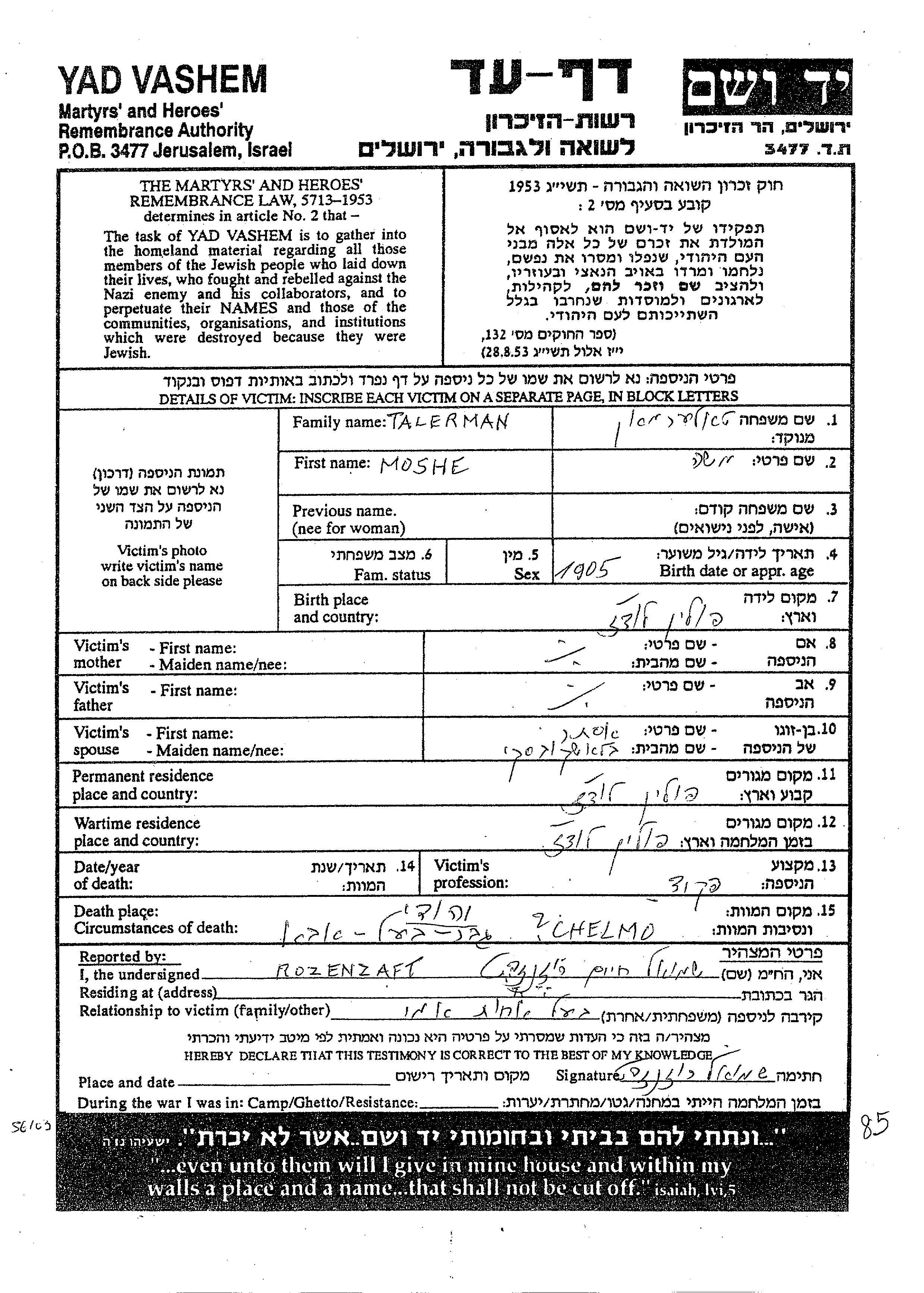 Моше Talerman, место рождения: Лодзь, Польша. Клерк. Место жительства до войны: Лодзь, Польша. Место во время войны: Лодзь, Польша.