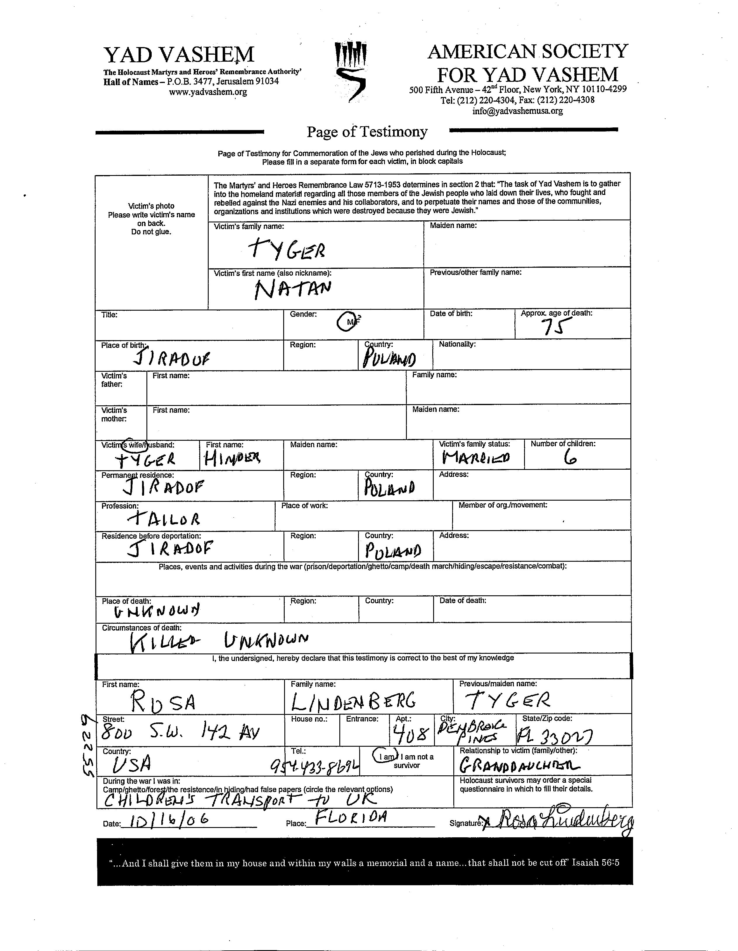 Натан Тыгер, место рождения: Жирардов, Польша. Женат / замужем. Место жительства до войны: Жирардов, Польша. Место во время войны: Жирардов, Польша.