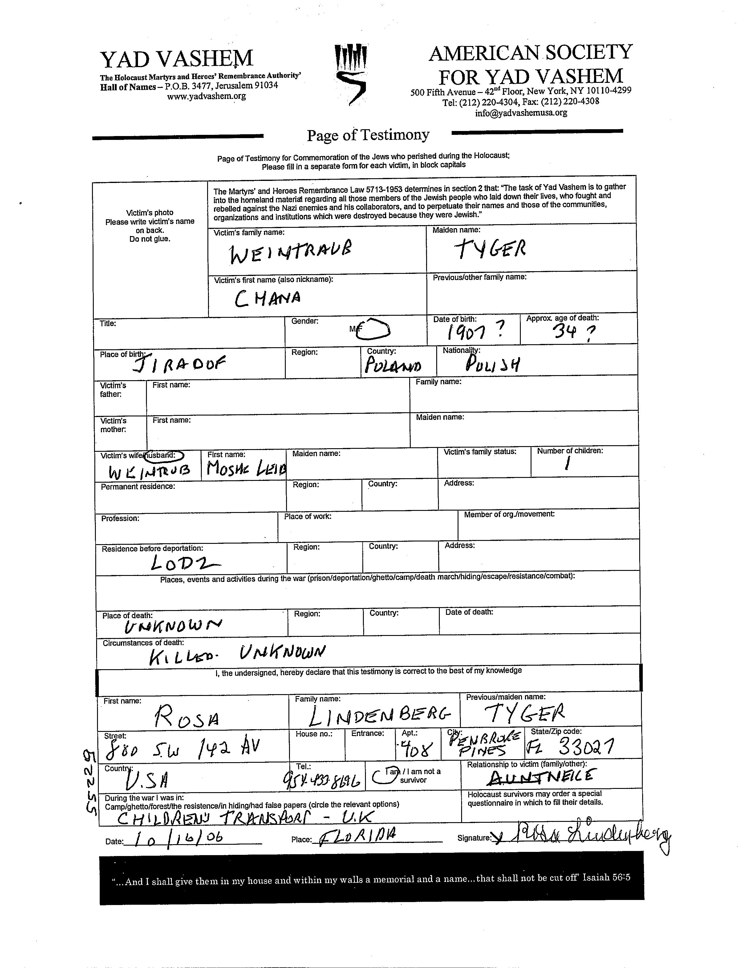 Хана Вейнтрауб, девичья фамилия Тыгер, место рождения: Жирардов, Польша. Женат / замужем. Место во время войны: Лодзь, Польша.