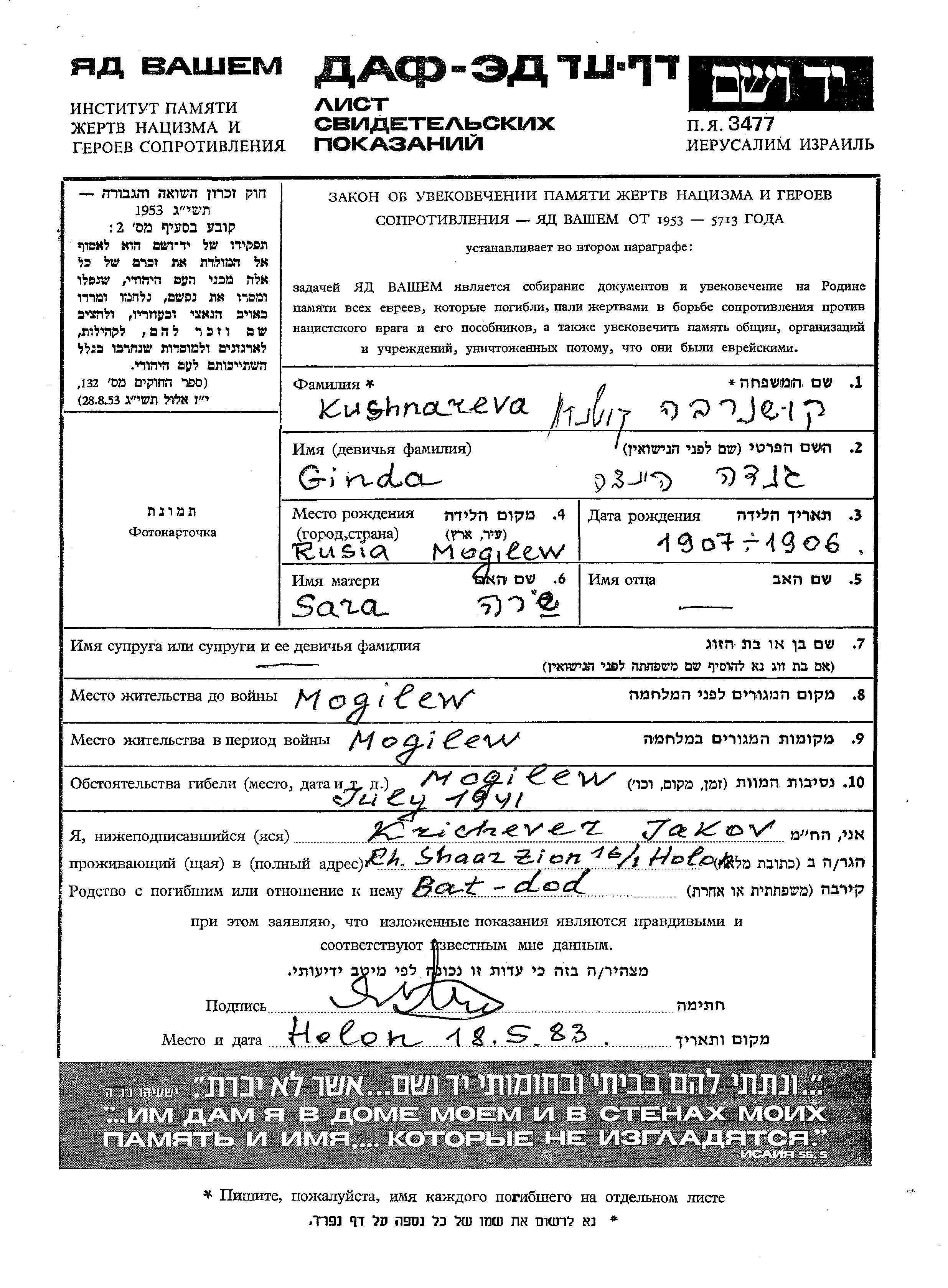 Кушнарёва Гинда 1906 Могилёв-Подольский, Украина (СССР) Лист свидетельских показаний