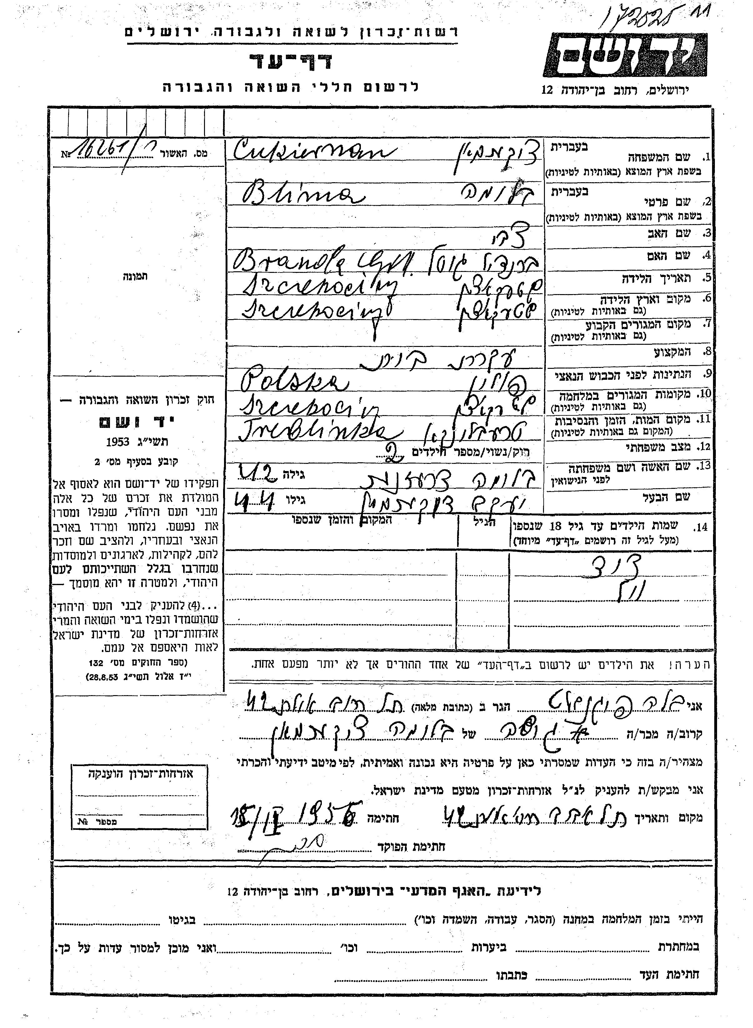 Блима Цукерман, девичья фамилия Дрезнер, место рождения: Щекоцин, Польша. Отец: Цви, mать:Бранда Гитл Гутл. Домохозяйка. Женат / замужем. Место жительства до войны: Щекоцин, Польша. Место во время войны: Щекоцин, Польша.