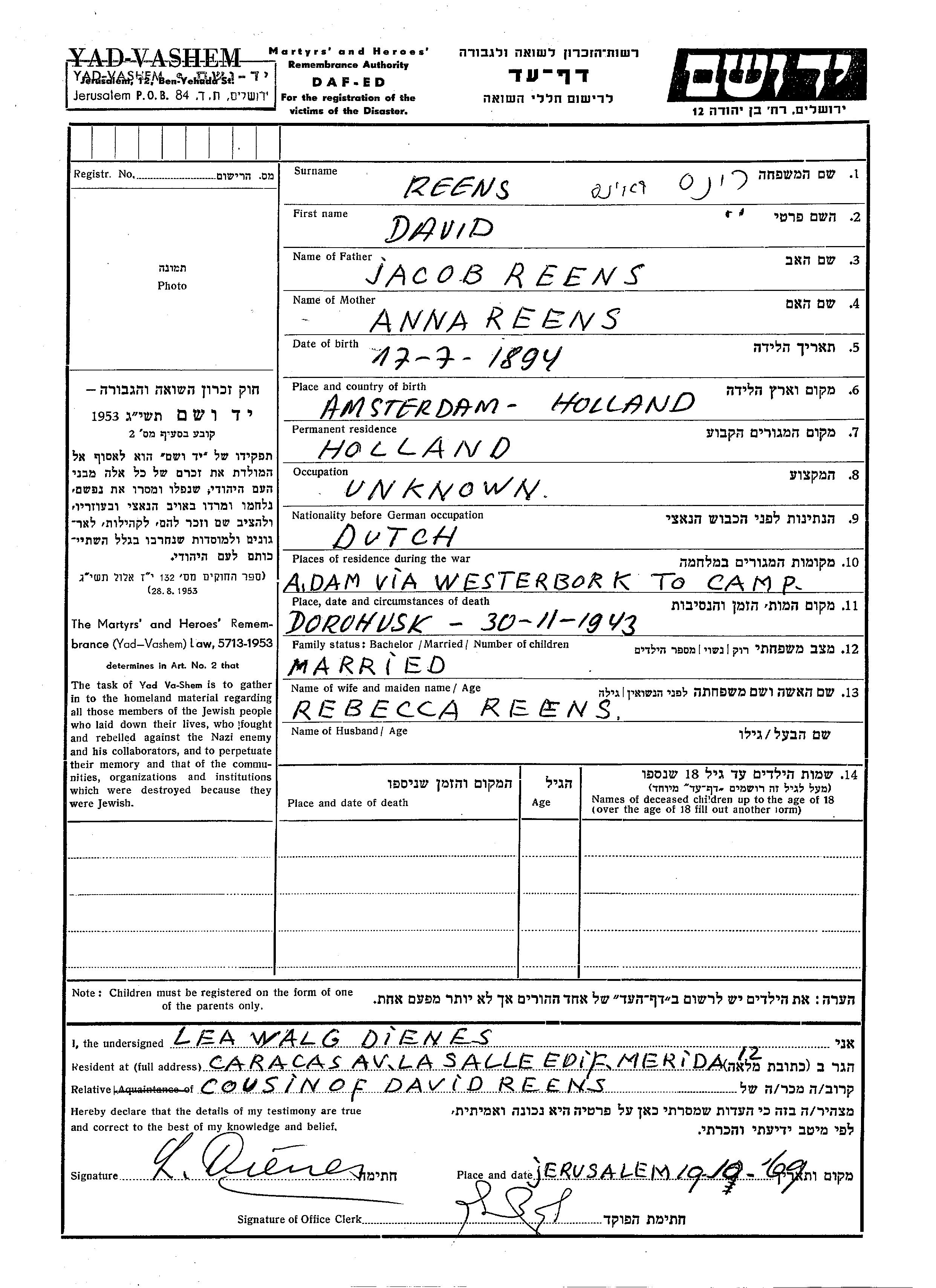 Давид Рейнес Ренс, место рождения: Амстердам, Нидерланды. Отец: Якоб, mать:Анна. Женат / замужем. Место жительства до войны: Нидерланды. Место во время войны: Вестерборк, Нидерланды.