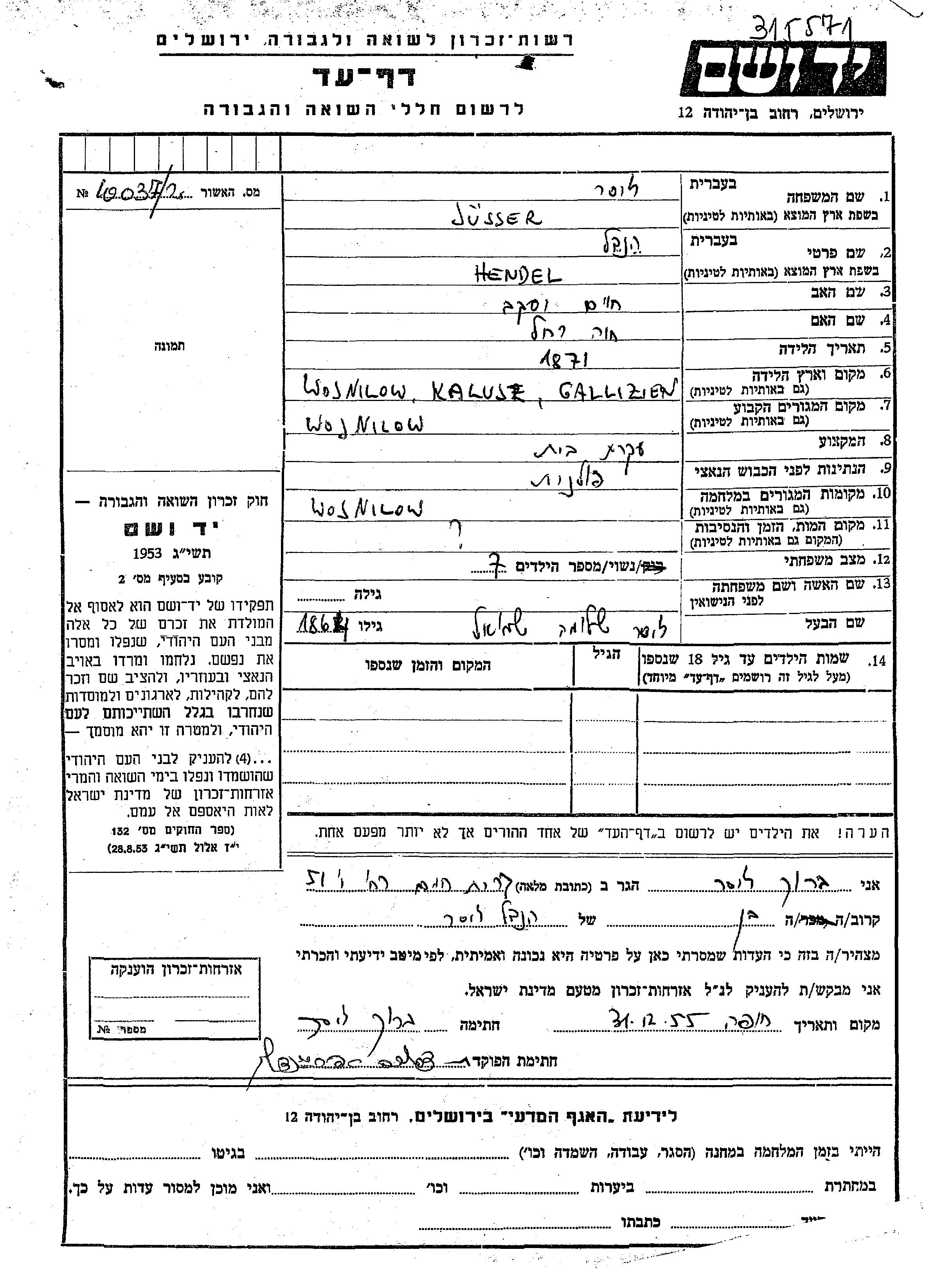 Хендель Зюсер, место рождения: Войнилов, Польша. Отец: Хаим Яков, mать:Хава Рахель. Домохозяйка. Женат / замужем. Место жительства до войны: Войнилов, Польша. Место во время войны: Войнилов, Польша.