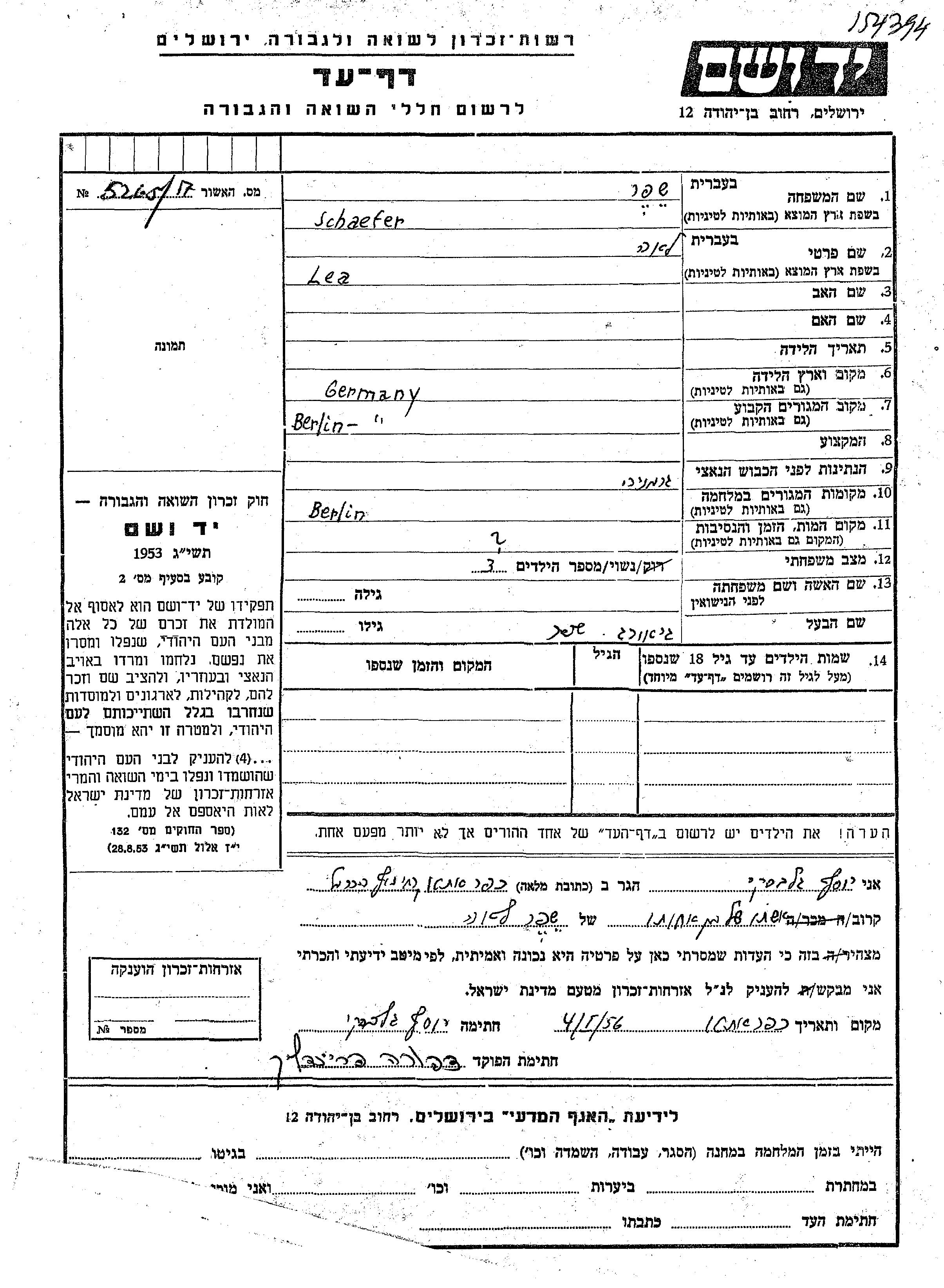 Лея Шефер, место рождения: Германия. Женат / замужем. Место жительства до войны: Берлин, Германия. Место во время войны: Берлин, Германия.