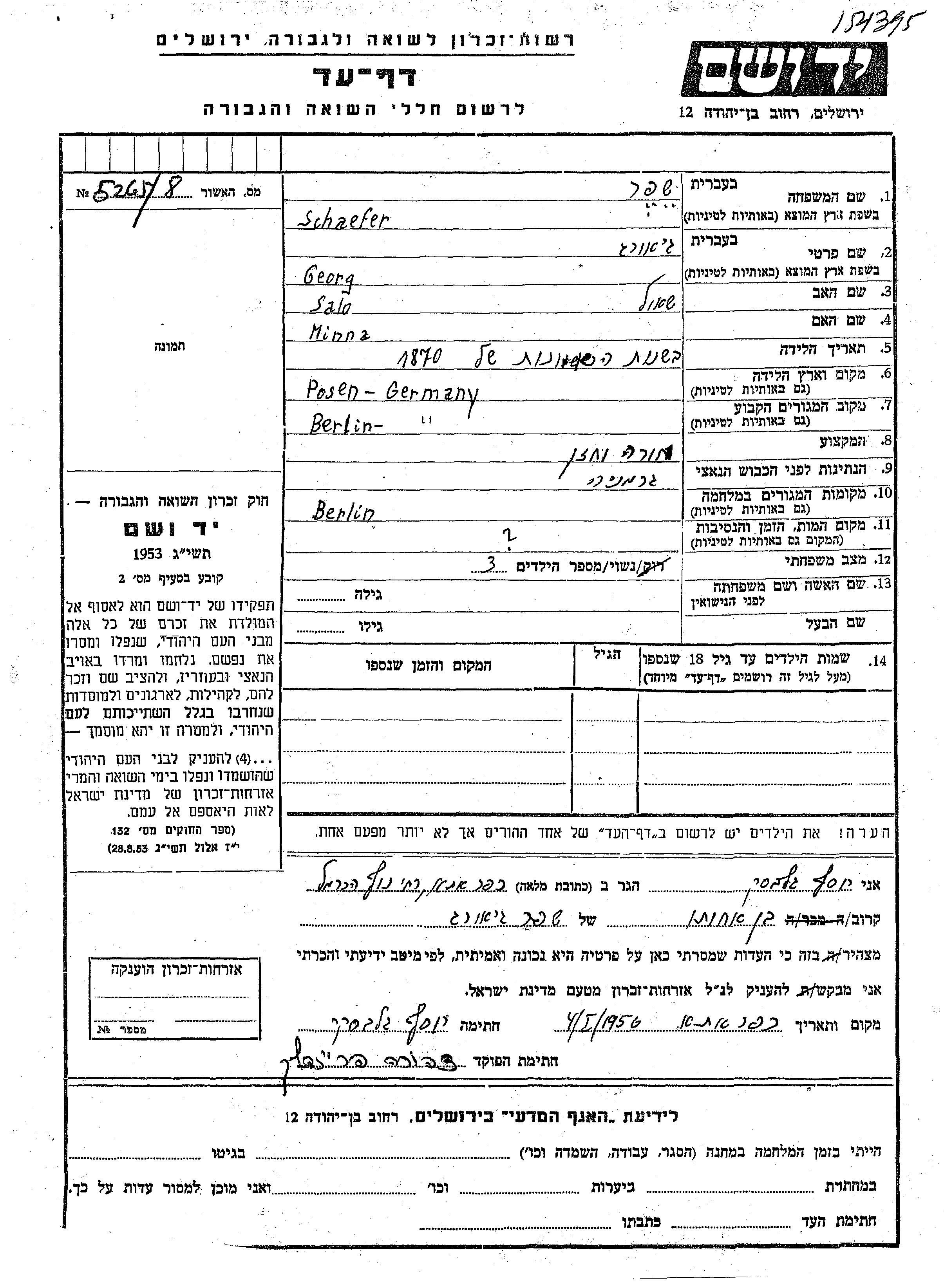 Гиорг Шефер, место рождения: Познань, Польша. Отец: Шало Шауль, mать:Минна. Учитель / учительница. Женат / замужем. Место жительства до войны: Берлин, Германия. Место во время войны: Берлин, Германия.