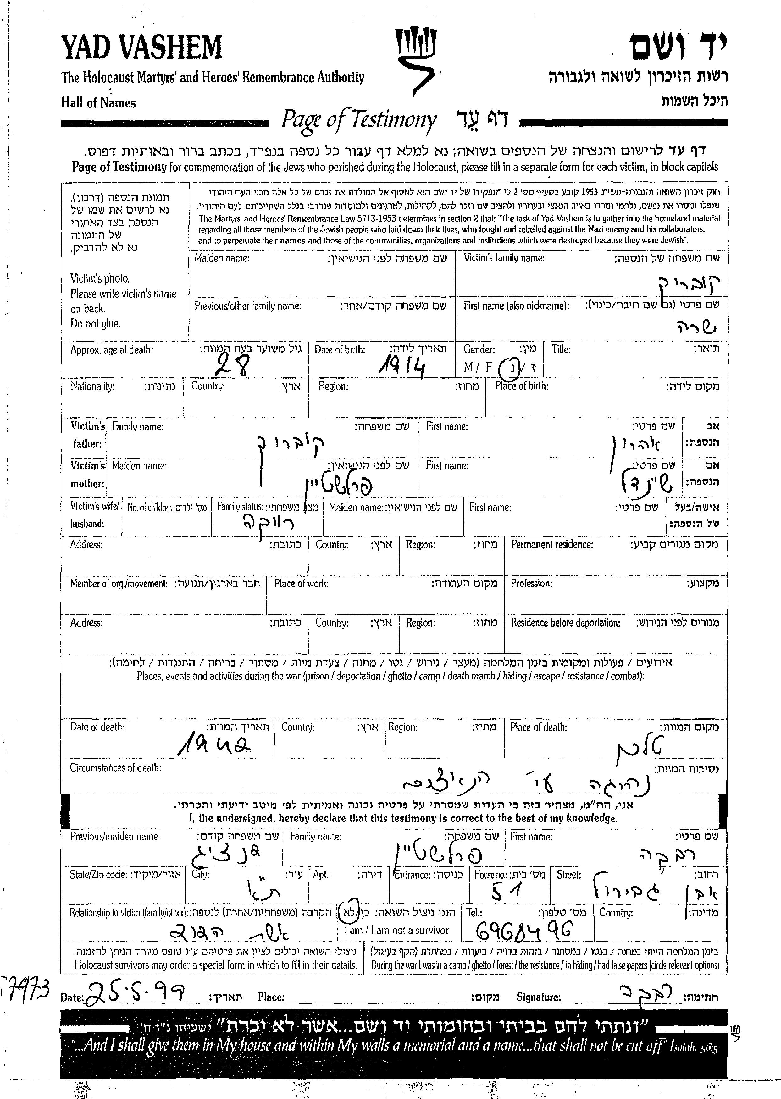 Яд Вашем - Листы свидетельских показаний Мемориального фонда
