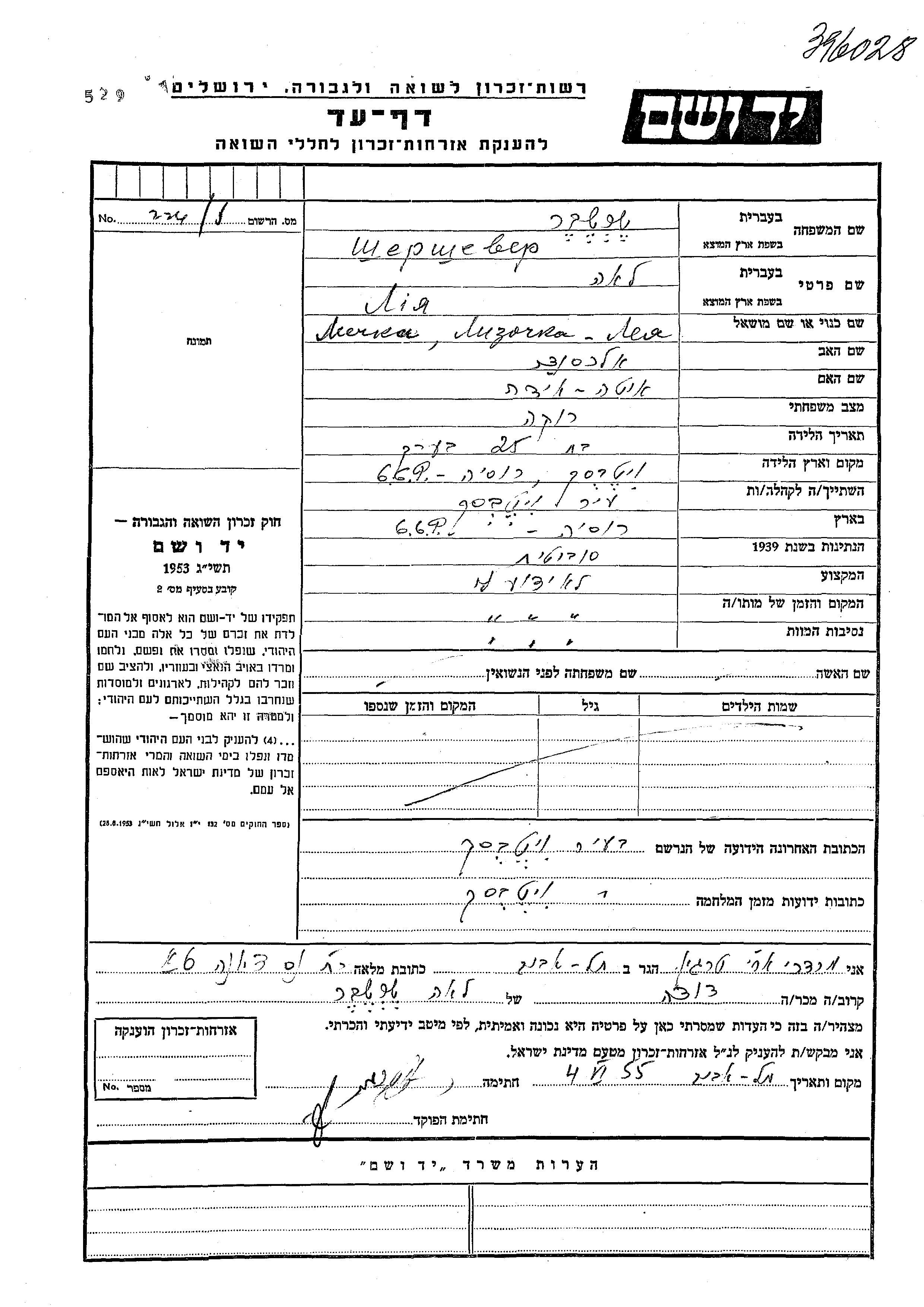 Лия Лизочка Шершевер, место рождения: Витебск, Белоруссия (СССР). Отец: Александер, mать:Ита Ида. Холост / не замужем. Место жительства до войны: Витебск, Белоруссия (СССР). Место во время войны: Витебск, Белоруссия (СССР). Лия Лизочка уничтоженa в период Шоа.
