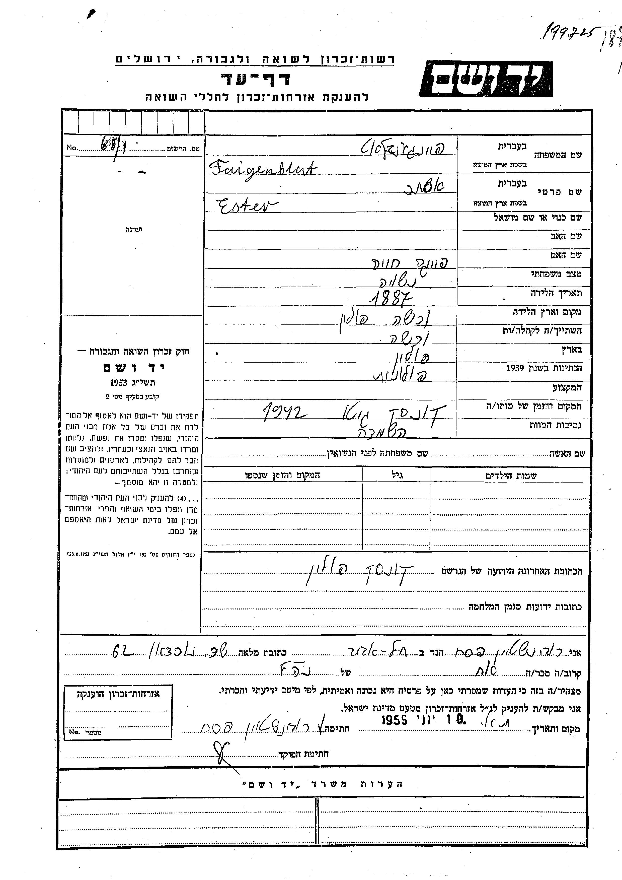 Эстер Файгенблат, место рождения: Варшава, Польша.Mать:Фейга Хая. Место жительства до войны: Варшава, Польша.