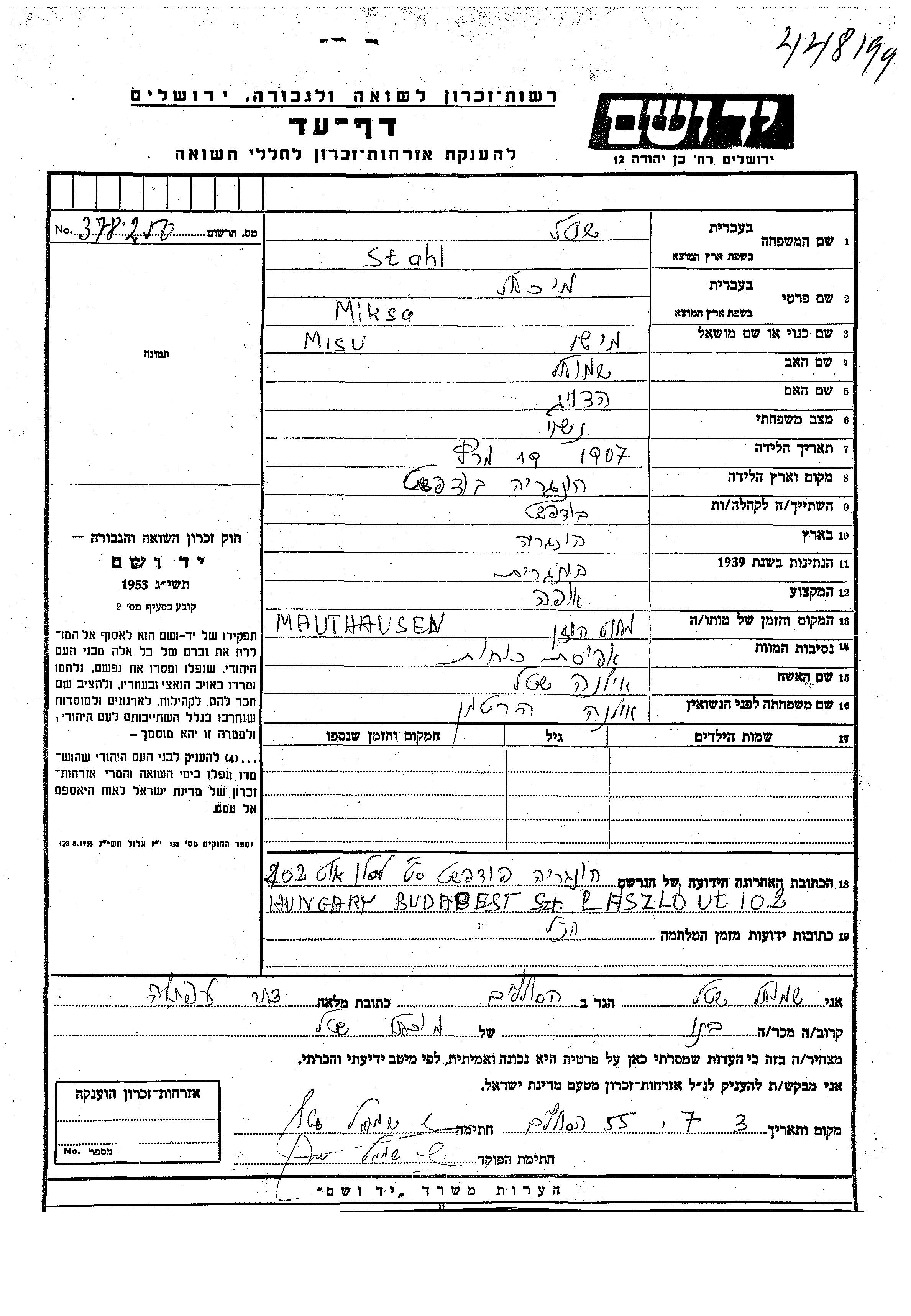 Микса Мишу Шталь, место рождения: Будапешт, Венгрия. Отец: Шмуэль, mать:Хедвиг. Пекарь. Женат / замужем. Место жительства до войны: Будапешт, Венгрия. Место во время войны: Будапешт, Венгрия.