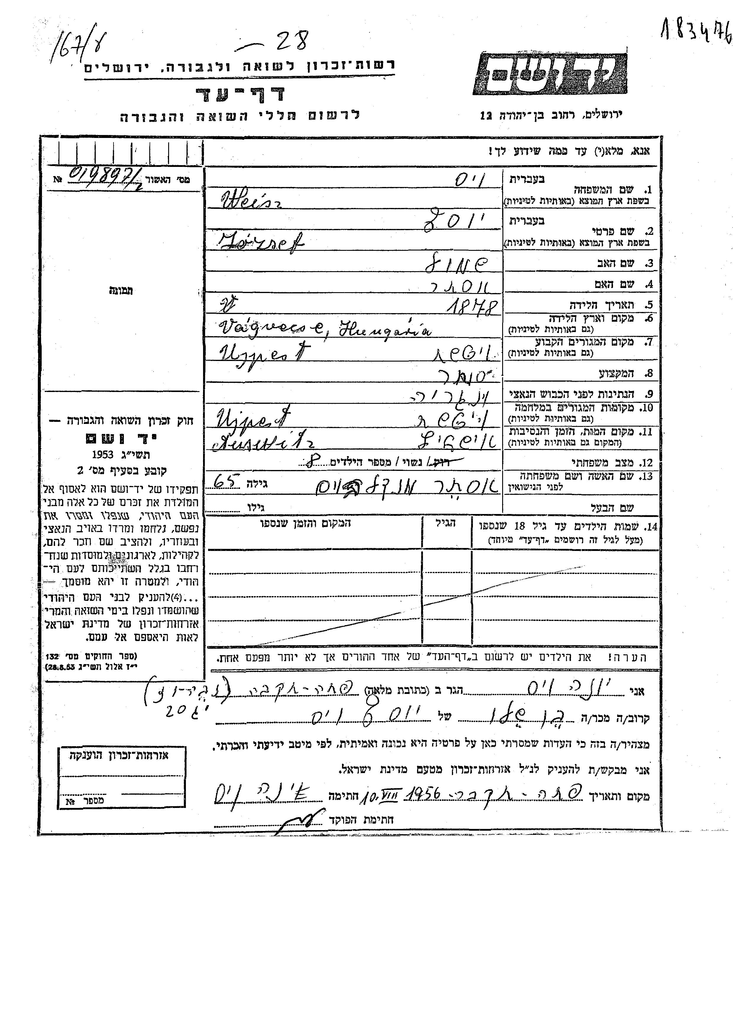 Йозеф Вайсс, место рождения: Вагвече, Чехословакия. Отец: Шмуль, mать:Эстер. Торговец / торговка. Женат / замужем. Место жительства до войны: Уйпешт, Венгрия. Место во время войны: Уйпешт, Венгрия.