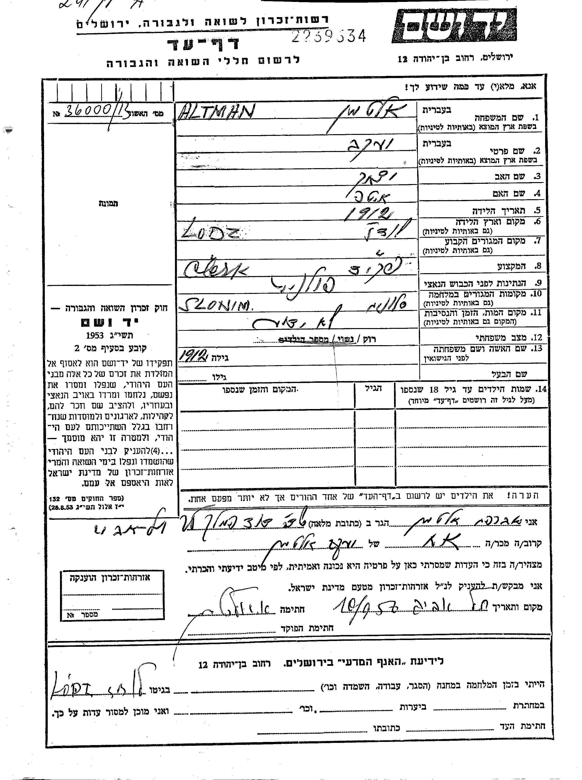 Яков Альтман, место рождения: Лодзь, Польша. Отец: Ицхак, mать:Ита. Клерк. Холост / не замужем. Место жительства до войны: Лодзь, Польша. Место во время войны: Слоним, Польша.