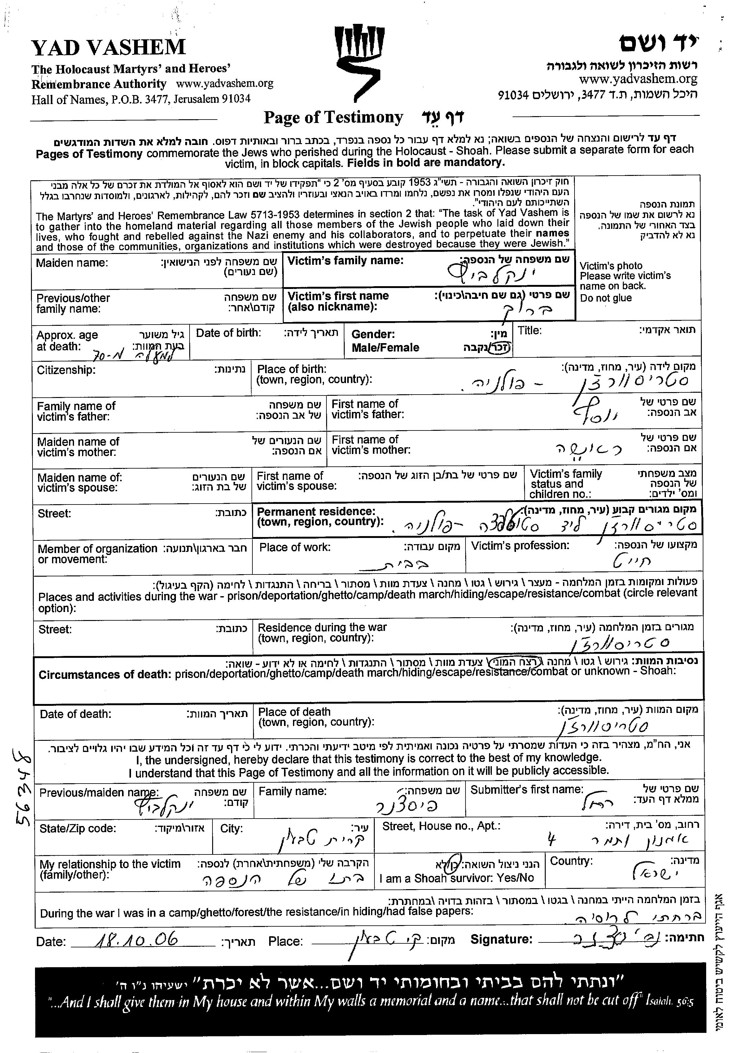 Янкелевиц Барух Старый Свержень, Польша Лист свидетельских показаний