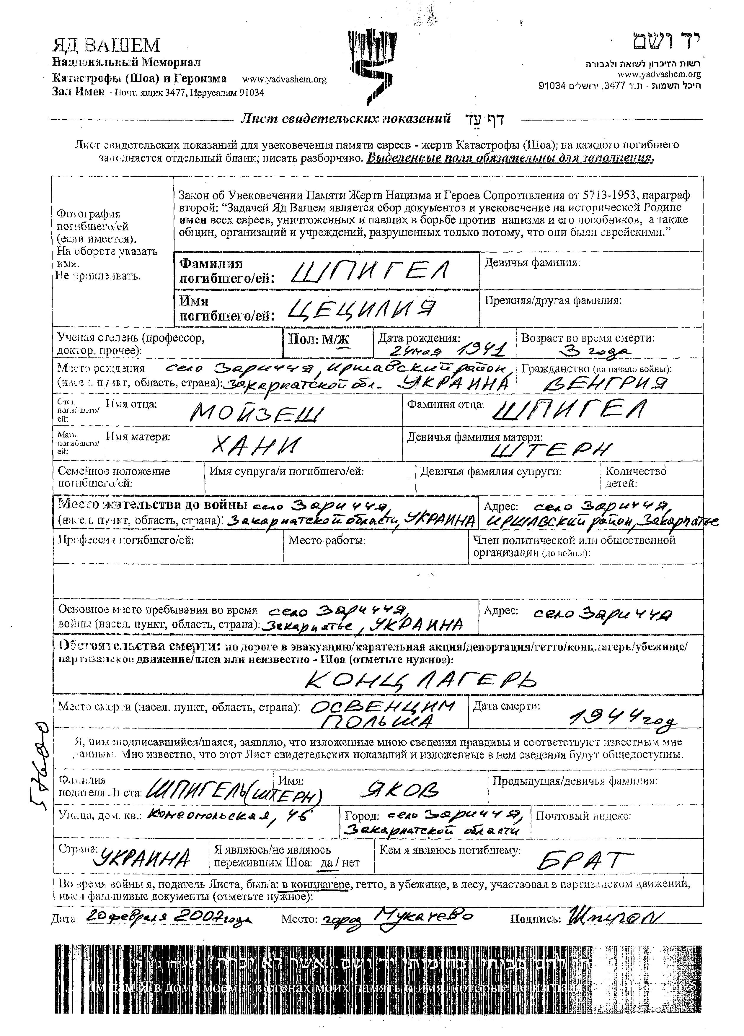 Шпигель Цецилия 1941 Зарича, Чехословакия Лист свидетельских показаний