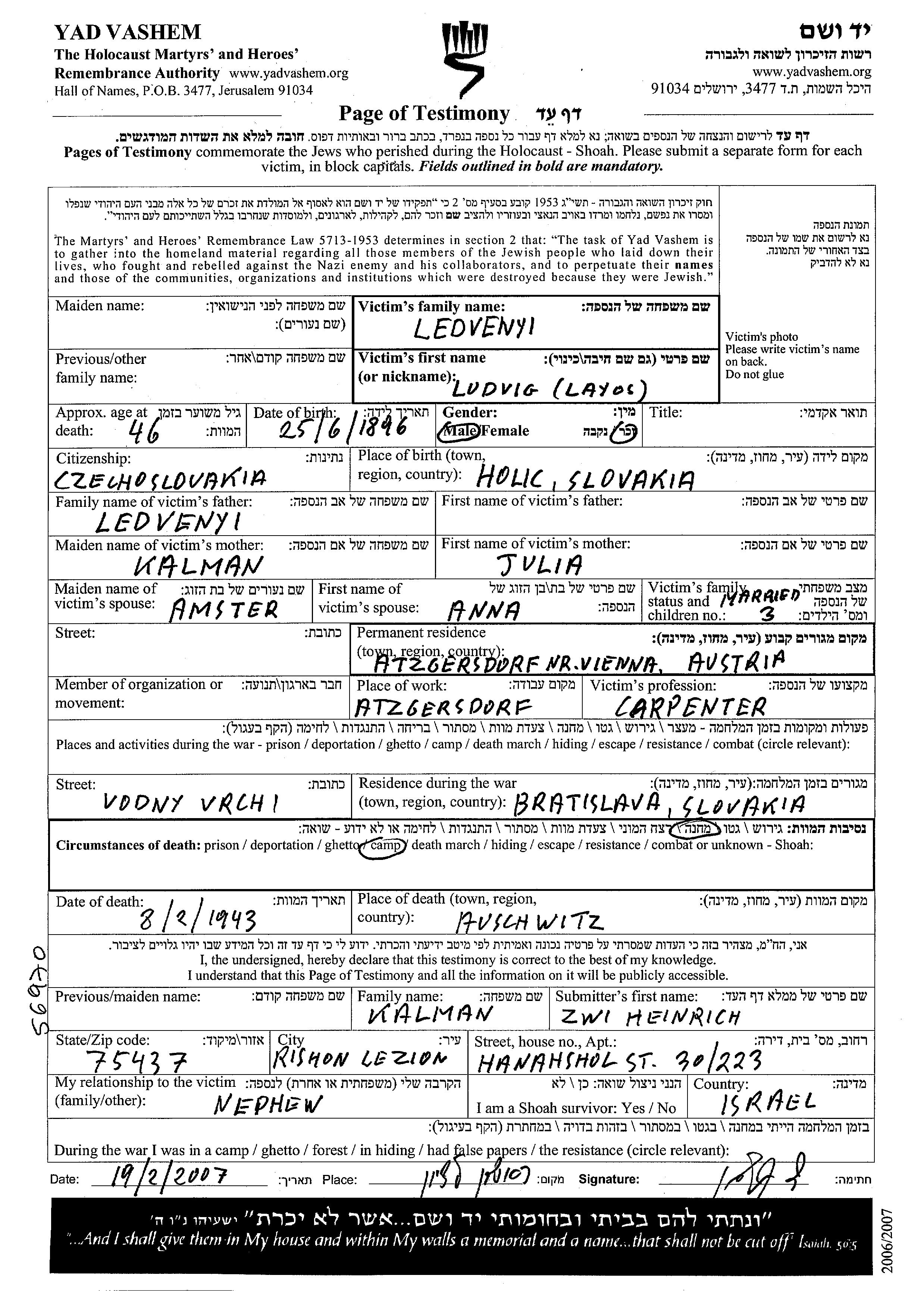 Лайош Людвиг Ледвеньи, место рождения: Голич, Чехословакия.Mать:Юлия, девичья фамилия Кальман. Столяр / плотник. Женат / замужем. Место жительства до войны: Ацгерсдорф, Австрия. Место во время войны: Братислава, Чехословакия.