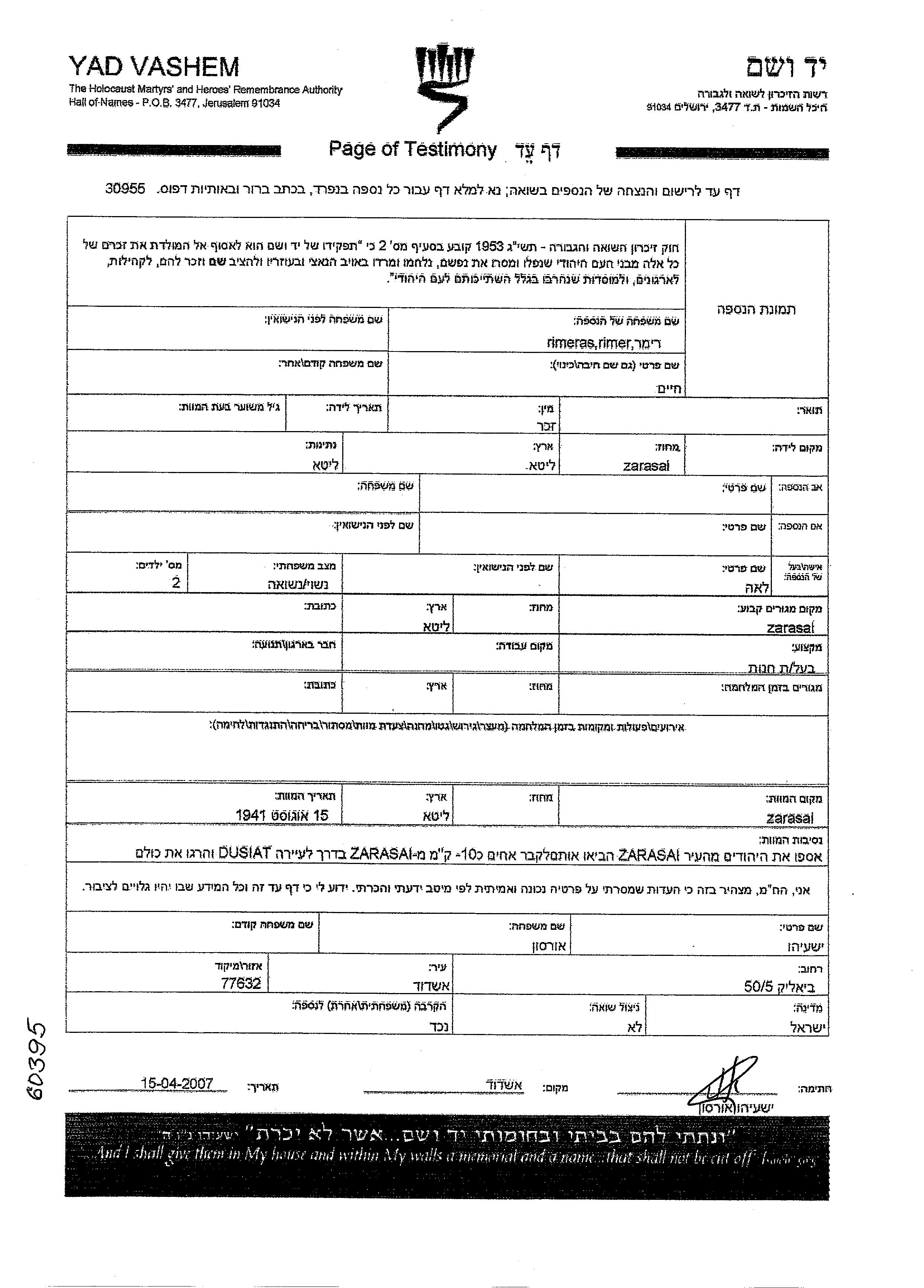 Хаим Ример, место рождения: Зарасай, Литва. Владелец / владелица магазина. Женат / замужем. Место жительства до войны: Зарасай, Литва. Место во время войны: Зарасай, Литва. Хаим уничтожен в период Шоа. место смерти: Зарасай, Литва в 15/08/1941.