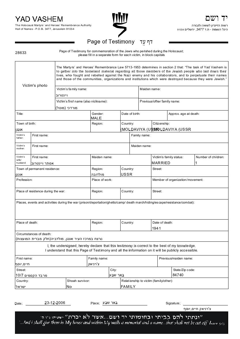 Во время Шоа евреев уничтожали разными способами: газовые камеры, расстрелы, их заживо хоронили или сжигали, непосильным принудительным трудом, голодом, эпидемиями, отсутствием минимальных гигиенических условий и медицинского обслуживания, и т.д. Некоторые евреи добровольно расстались со своей жизнью, чтобы избежать ареста и дальнейших преследований или чтобы покончить с безысходностью и бесконечными страданиями. Десятки тысяч еврейских солдат, служивших в Советской армии и попавших в плен, , были отобраны как евреи и убиты. Многие были зарегистрированы как «пропавшие без вести».