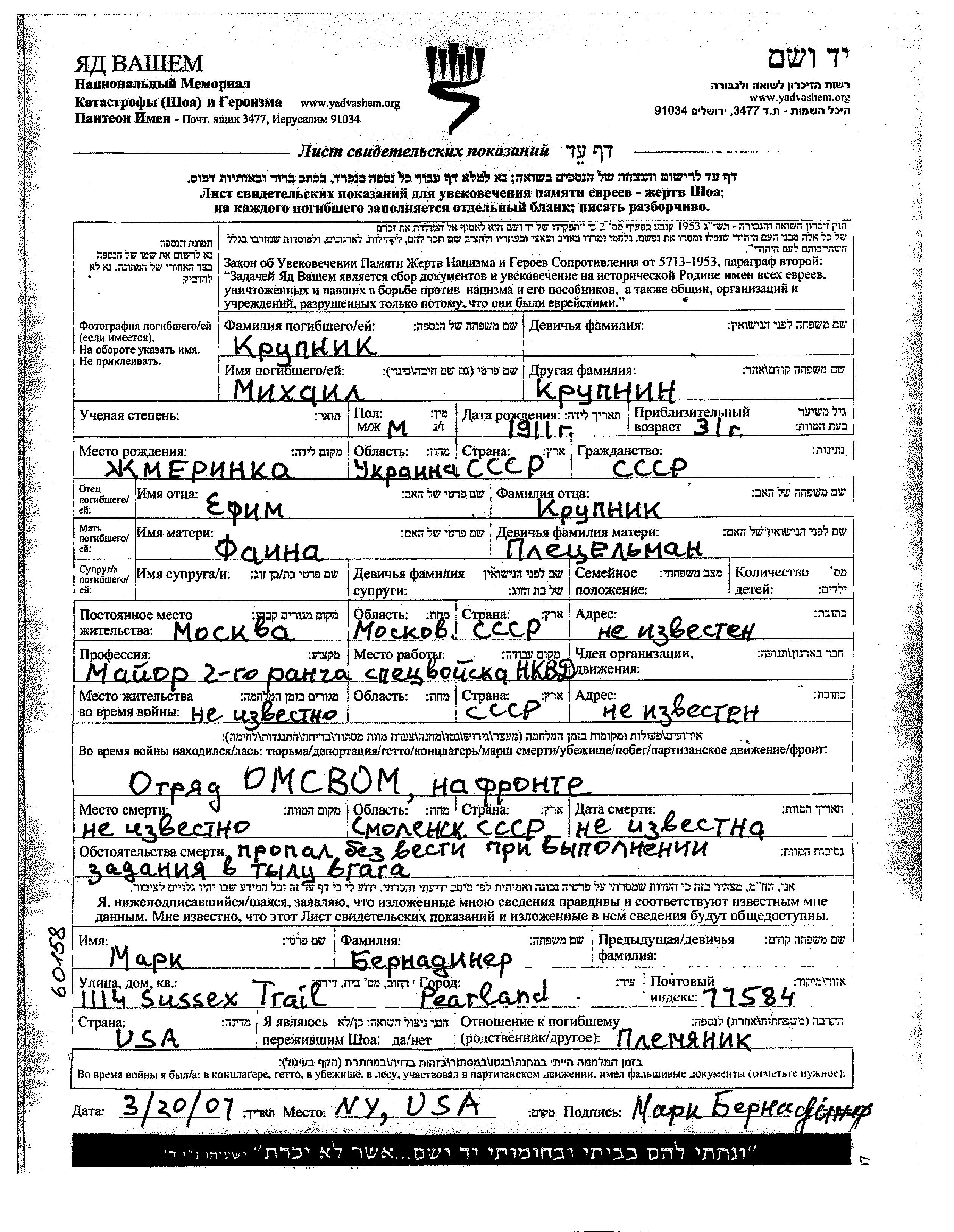 Крупник Крупнин Михаил 1911 Москва, Россия (СССР) Лист свидетельских показаний