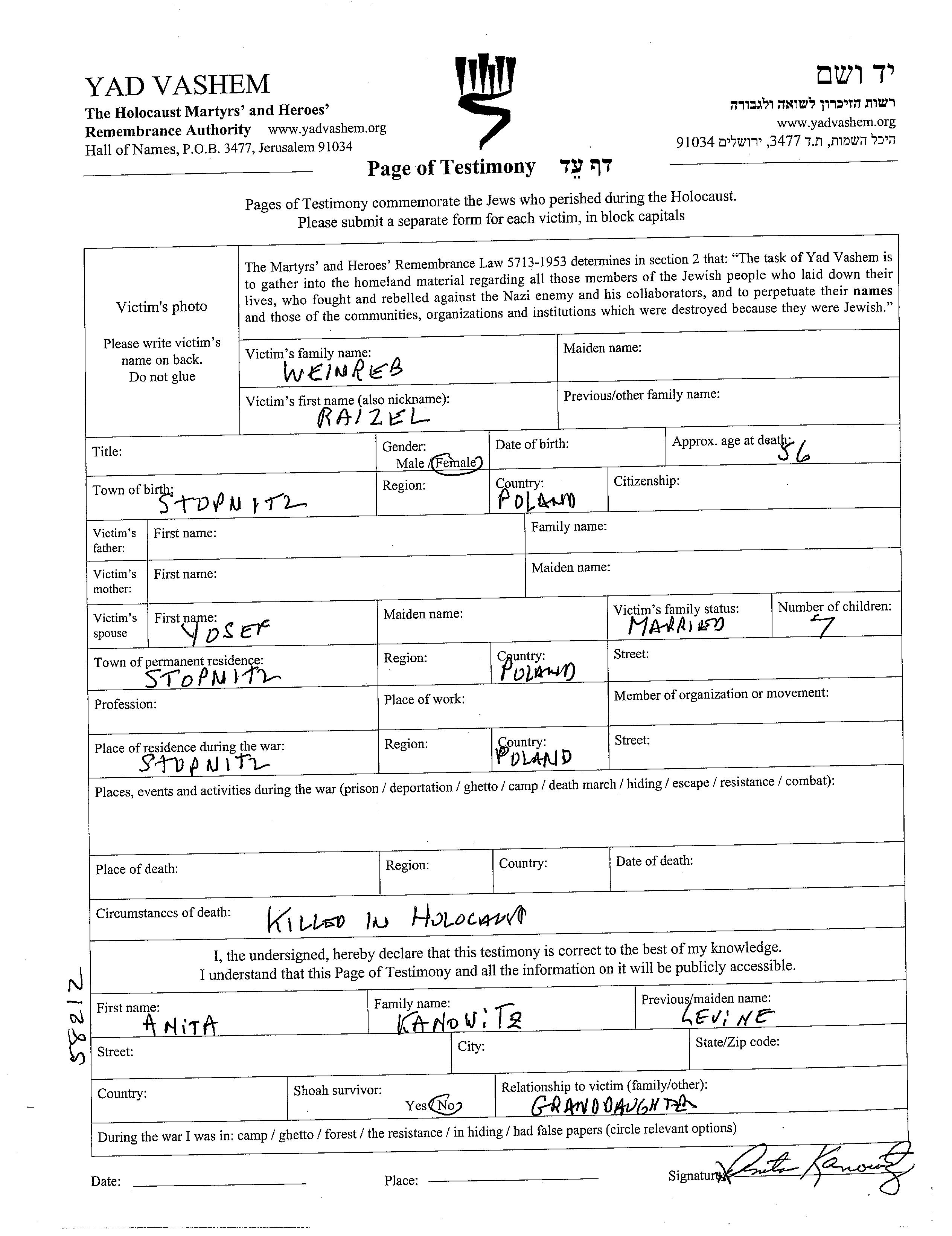 Вайнреб Райзел Стопница, Польша Лист свидетельских показаний