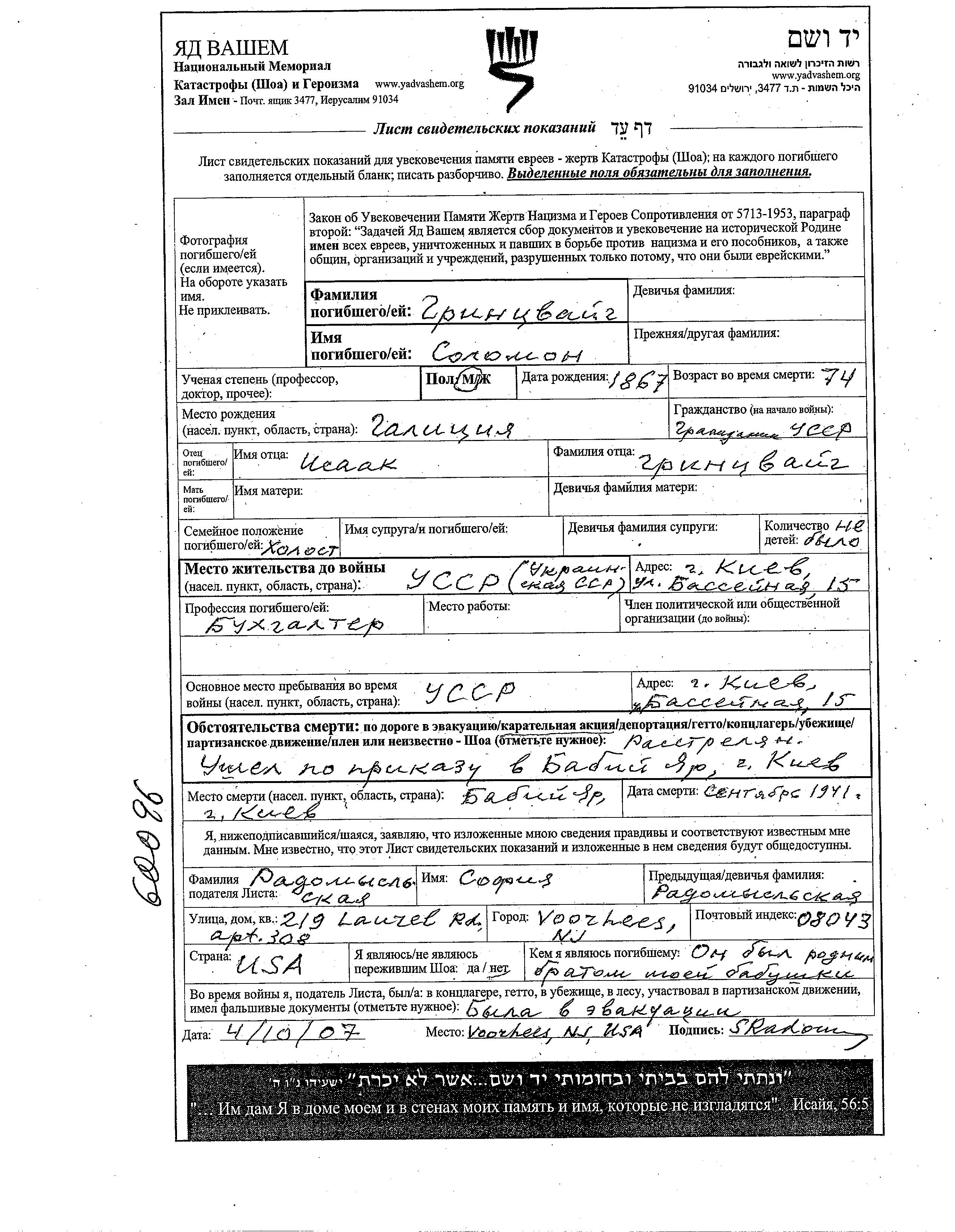 Соломон Гринцвейг, место рождения: Галиция, Польша. Отец: Исаак. Бухгалтер / счетовод. Холост / не замужем. Место жительства до войны: Киев, Украина (СССР). Место во время войны: Киев, Украина (СССР).