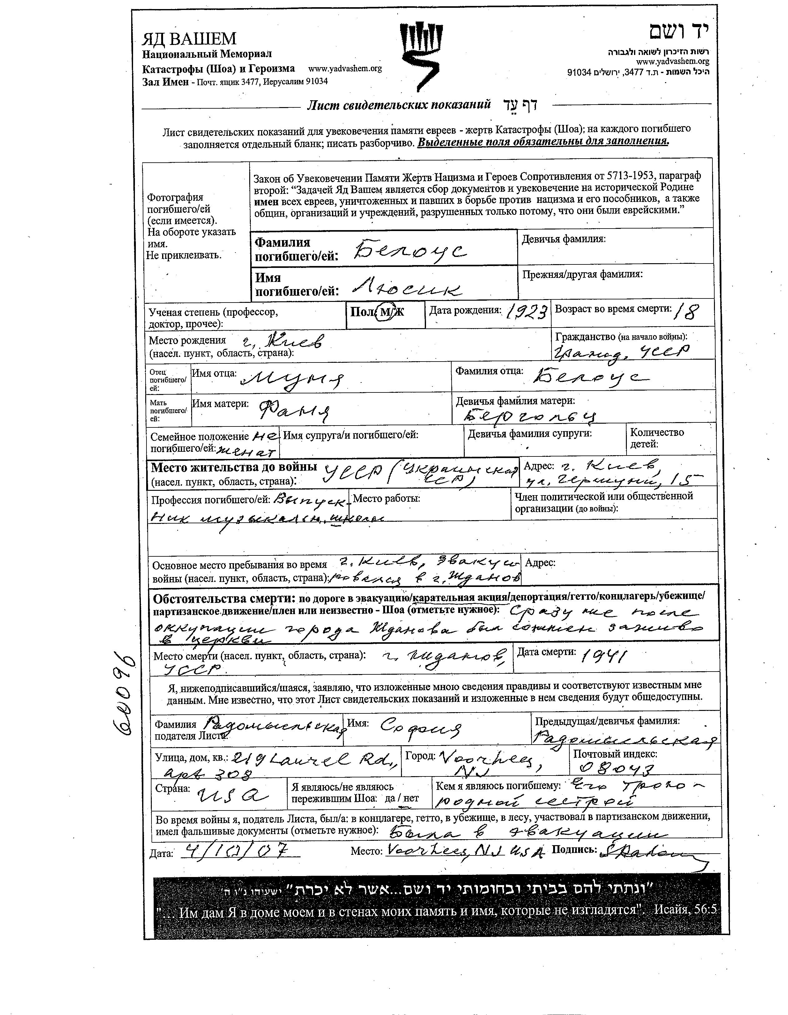 Белоус Люсик 1923 Киев, Украина (СССР) Лист свидетельских показаний
